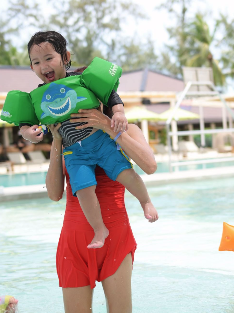 依相可見,以紅色水著示人的Grace在泳池中用雙手將Carlos高高舉起,母子綻放燦爛笑容,囝囝更是笑到見牙不見牙,看得出來非常沉浸其中。可愛笑容即刻俘虜不少網民:「你嘅招牌笑容,遺傳咗比佢哋」、「細仔好可愛,不過靚媽仲索」。![]()