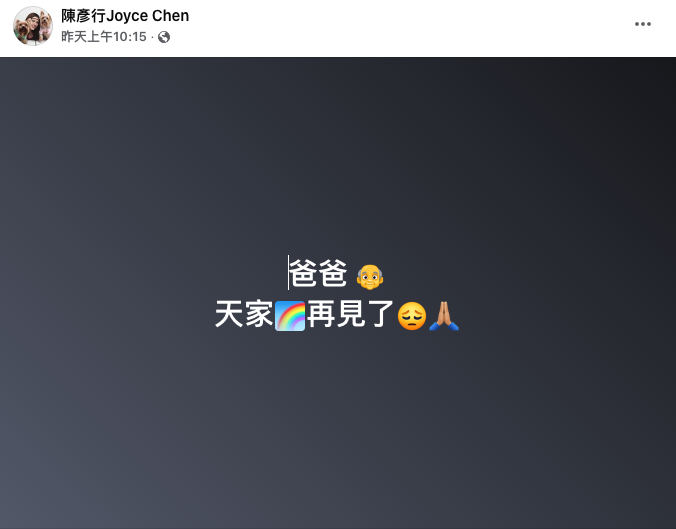 現年47歲的陳彥行(行姐),因劇集《皆大歡喜》系列中擔任主演之一而深受觀眾喜愛為觀眾熟悉,後來淡出娛樂圈。多年來均宣稱自己單身的陳彥行行姐在數月前突然公開3年前已秘密生女,並曬出多張女兒萌照,消息一出震驚娛樂圈。不過,陳彥行行姐日前(29日)竟傳出噩耗,她在社交平台透露父親離世消息,惹網民憂心。