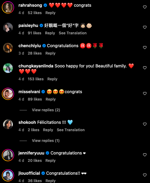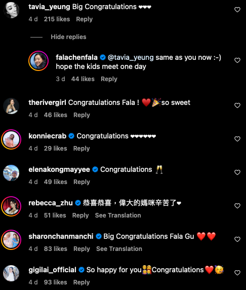 人緣甚好的法拉也在第一時間收獲圈內好友們的祝福,如楊茜堯、鍾嘉欣、黎姿、陳敏之、陳自瑤、江美儀、朱晨麗等都紛紛留言恭賀,法拉更回覆茜堯,希望雙方的孩子們有朝一日能見面一起玩!