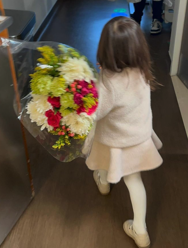 法拉更分享女兒捧著一束鮮花向前奔跑的背影照:「We are now a family of FOUR! 👨👩👧👦Big sister was so exited to meet her little brother. (中譯:我哋而家係一家四口! 家姐迫不及待要見細佬喇」。非常有愛!