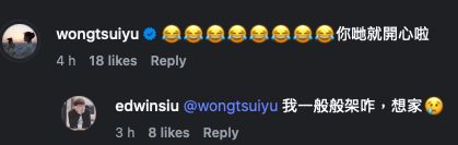 黃翠如見到眾人聚餐的照片後,隨即在留言區「投訴」老公蕭正楠:「你哋就開心啦!」蕭正楠見狀立刻展現驚人的「求生慾」,火速回覆安慰太太:「我一般般架咋,想家😢」,笑爆網民!