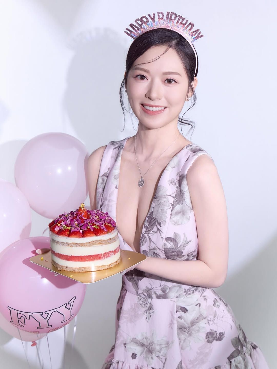 生日正日,馮盈盈在社交網大派福利,相中可見她頭戴「HAPPY BIRTHDAY」頭箍,穿上超Deep V背心裙,雙手捧住士多啤梨蛋糕,身邊還有粉紅色氣球寫上「FYY」氣球,開心拍照留念。