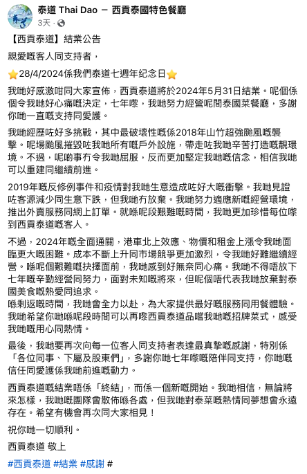 在聲明中,餐廳無奈表示捱得過山竹超強颱風兼疫情,但「2024年嘅全面通關,港車北上效應、物價和租金上漲令我哋面臨更大嘅困難。成本不斷上升同市場競爭更加激烈,令我哋好難繼續經營。喺呢個艱難嘅抉擇面前,我哋感到好無奈同心痛。我哋不得唔放下七年嘅辛勤經營同努力。」![]()