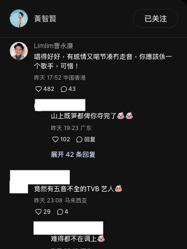 因為黃智賢的歌聲實在是太「驚為天人」,由頭到尾跑調兼走音,一時突然飆高音,一時又忘詞,感覺就如「超級無敵估歌仔」一樣,不單止惹得在偷拍的蔣祖曼全程忍笑,影片下的評論區也是一片熱議:「唱得很好,下次別唱了」、「張信哲都被唱哭」、「好厲害,一個音都不在調上」「可以搵陶大宇組隊,一齊唱《倒轉地球》」。不過,好兄弟曹永廉就非常給面子,留言道:「唱得好好,有感情又啱節奏冇走音,你應該係一個歌手,可惜!」,相當搞笑。
