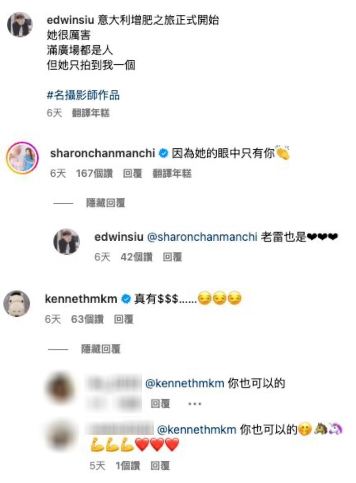 蕭正楠亦非常識得冧老婆,大讚黃翠如的攝影技術,「她很厲害,滿廣場都是人,但她只拍到我一個。#名攝影師作品」,陳敏之留言表示「因為她的眼中只有你」,簡直甜到漏!而馬國明則羨慕表示「真有$$$......」。