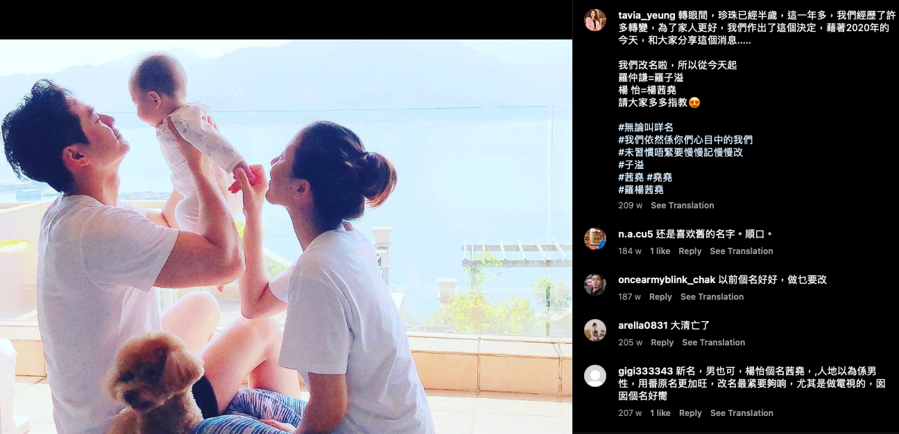 2020年,楊怡和羅仲謙趁着囡囡小珍珠半歲生日,宣布夫妻二人同時改名,分別改為「楊茜堯」和「羅子溢」,消息一出,瞬間引起網民熱議。二人雖然在社交平台上表示改名字只是為了家人更好,不過卻仍有不少網民質疑「子溢」這個名字是有求子的意思。其實子溢兩年前接受傳媒訪問時曾作出過解釋:「因為個女個名係搵師傅改嘅,但係師傅指如果想個女好啲,父母也要配合一下,產生個化學作用先會夠大,所以我哋都決定一齊改。」不過夫妻二人自己也清楚,羅仲謙及楊怡的名字早已深入民心,家喻戶曉,改名之後,觀眾一定容易混淆,因此兩人考慮改名時亦非常掙扎,子溢回憶起當時感受:「很掙扎,是非常掙扎!但做人父母最終還是以女兒的幸福為優先考慮,雖然我新名字像是為了求子,但並不是這樣。」