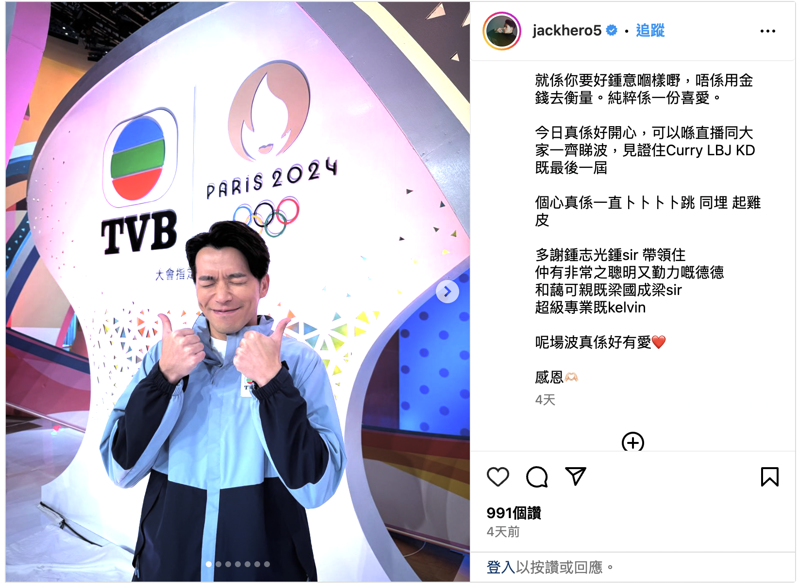 巴黎奧運雖已結束,但仍熱潮不減。不少觀眾透過奧運發掘到藝人另一面,例如「送水輝」許家傑!他在奧運男子籃球金牌戰突現身TVB直播室,與其他主持一起擔當旁述,他的表現更獲得觀眾大讚。他之後在社文平台發表感受,坦言自己「真係好開心,可以喺直播同大家一齊睇波,見證住Curry LBJ KD 既(嘅)最後一屆,個心真係一直卜卜卜卜跳同埋起雞皮。」他又感激當日在直播室帶領他的同事們。![]()