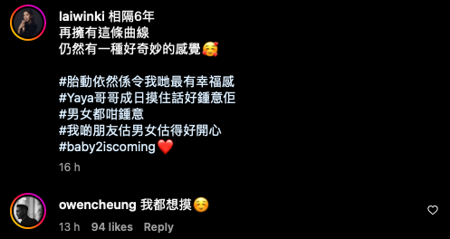 賴慰玲3月出席劇集《婚後事》宣傳活動時穿平底鞋,惹來懷孕傳言,不過當時她就否認有喜。而在今月月初,賴慰玲出席監製王心慰榮休宴以及為《2024香港小姐競選》外景拍攝時,她也只是穿寬鬆外套遮肚,未有透露二胎喜訊。如今賴慰玲正式公布好消息,圈中好友們如張振朗、陳瀅、陳嘉寶、江嘉敏、何雁詩、陳凱琳、龔嘉欣、蔣祖曼、陳煒、傅嘉莉、趙希洛、馮盈盈、鄭俊弘、JW王灝兒等都有留言送祝福,而張振朗回應賴慰玲囝囝「成日摸肚」的留言最為爆笑,他竟表示「我也想摸」!賴慰玲也搞笑回覆老友:「希望冇人恭喜你」。![]()