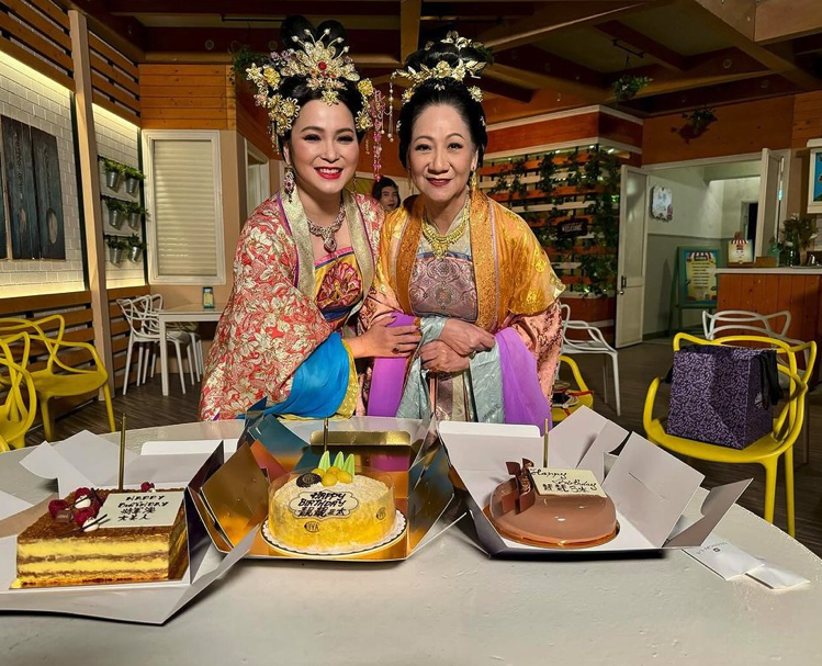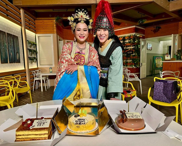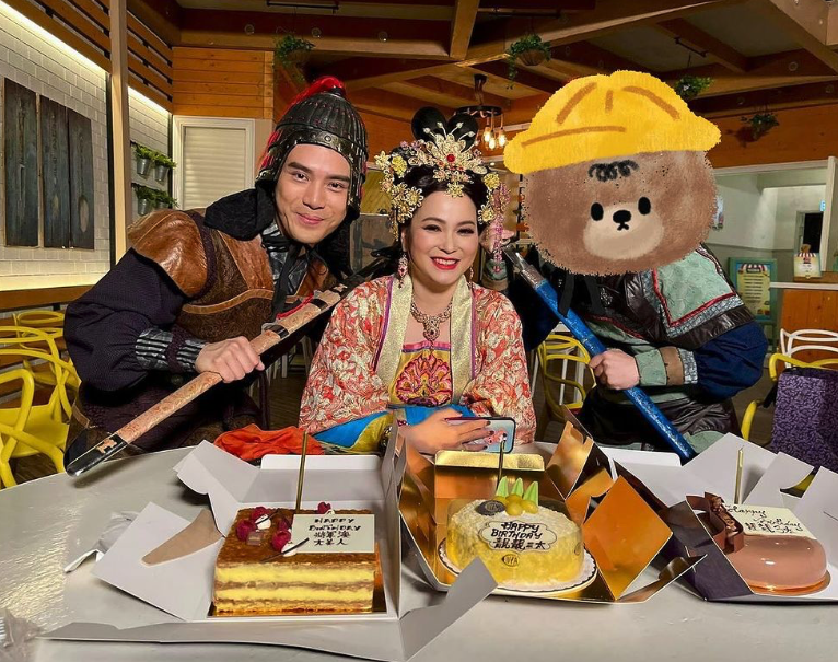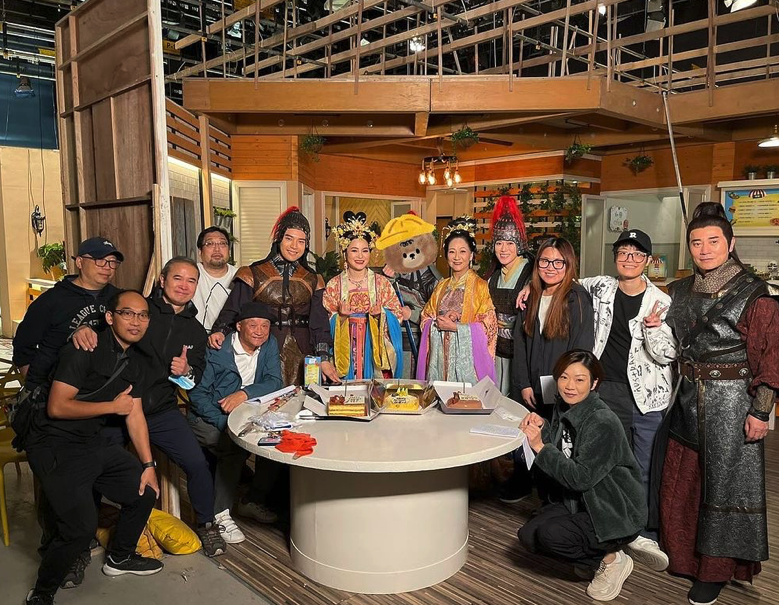 見三太及眾人身穿古裝,便知大家正在拍攝「穿越」戲份,以「貴妃裝」示人的三太儀態萬千,相當凍齡!她逐一跟同場的演員合照留念,除了三太最錫的風風(陳浚霆飾)外,林淑敏、歐瑞偉、蘇恩磁及一眾幕後工作人員都有出鏡,現場非常熱鬧!三太甜蜜留言道:「多謝風風同阿姐,瑞偉哥,大小姐,神秘人,台前幕後的各位!好有愛的《愛回家》!」![]()
