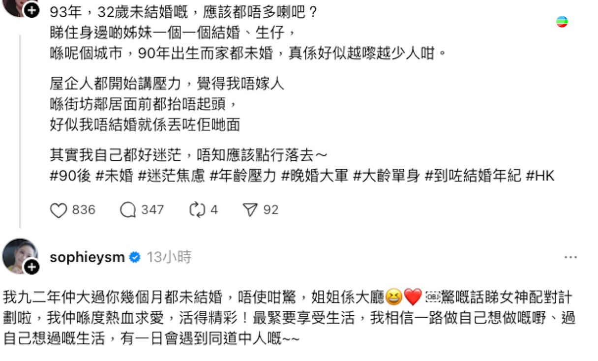 貼文一出引起不少網友留言,更引出《女神配對計劃》的葉蒨文現身說法,1992年出生的葉蒨文以過來人身份教路:「我九二年仲大過你幾個月都未結婚,唔使咁驚,姐姐係大廳😆❤️」她又趁機力Sell《女神配對計劃》,續說:「驚嘅話睇女神配對計劃啦,我仲喺度熱血求愛,活得精彩!」之後她再以正經Mode說:「最緊要享受生活,我相信一路做自己想做嘅嘢、過自己想過嘅生活,有一日會遇到同道中人嘅~~」雖然葉蒨文講得很有道理,但亦網友覺得葉蒨文的條件太好,不愁沒伴,留言:「您當然唔驚,太多選擇!」、「你點同😂😂全宇宙既男人都想同你一齊」![]()