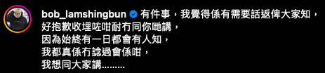 不過邊個又話無可能先?今日(6日)下午,Bob在社交平台突然po出四個仔女和老婆抱著bb的合照,見他們笑容滿面望住鏡頭,真係隔著個mon都感受到那份甜蜜與喜悅!Bob還寫道:「有件事,我覺得係有需要話返俾大家知,好抱歉收埋咗咁耐冇同你哋講,因為始終有一日都會有人知,我都真係冇諗過會係咁,我想同大家講………」唔通⋯⋯願望成真?恭喜恭喜!