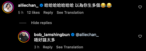 喂喂喂等等,仲未完呀!原來一片留白下面還有一句至關重要的話揭開謎底:「朱慧敏同陳醫生個BB女真係好得意。」噢~原來係咁!不過不止網民,連圈中好友們都被他「嚇咗一跳」呀,好似王灝兒、黃翠如都貼出哭笑不得的表情,而陳雅麗更在評論區爆笑留言:「以為你生多個。」Bob則回覆:「唔好諗太多。」看來這位「多仔公」仍未有升級「五仔老竇」,大家唔駛心急住呀!