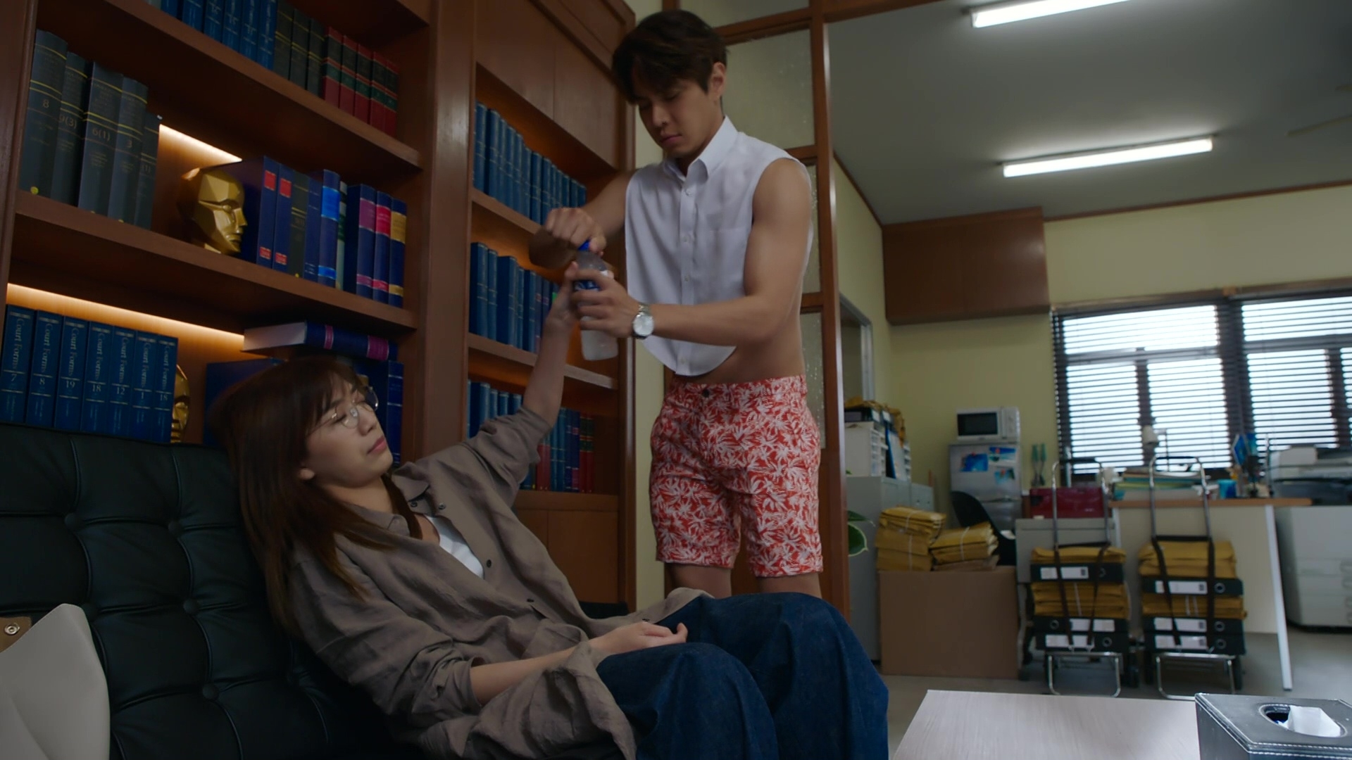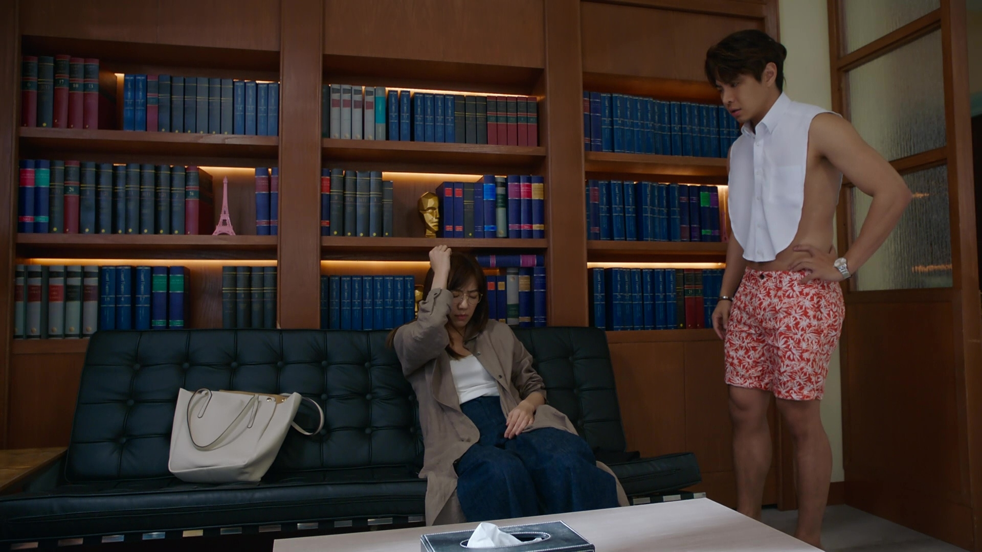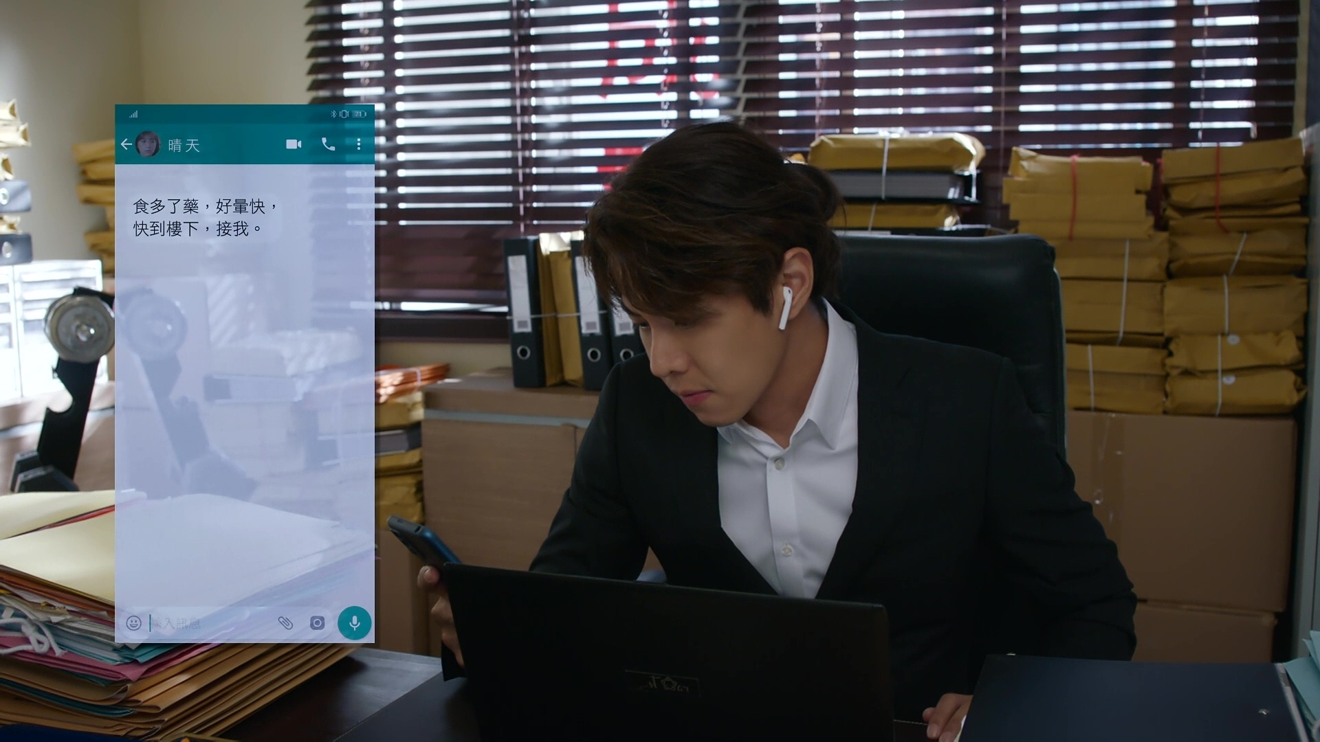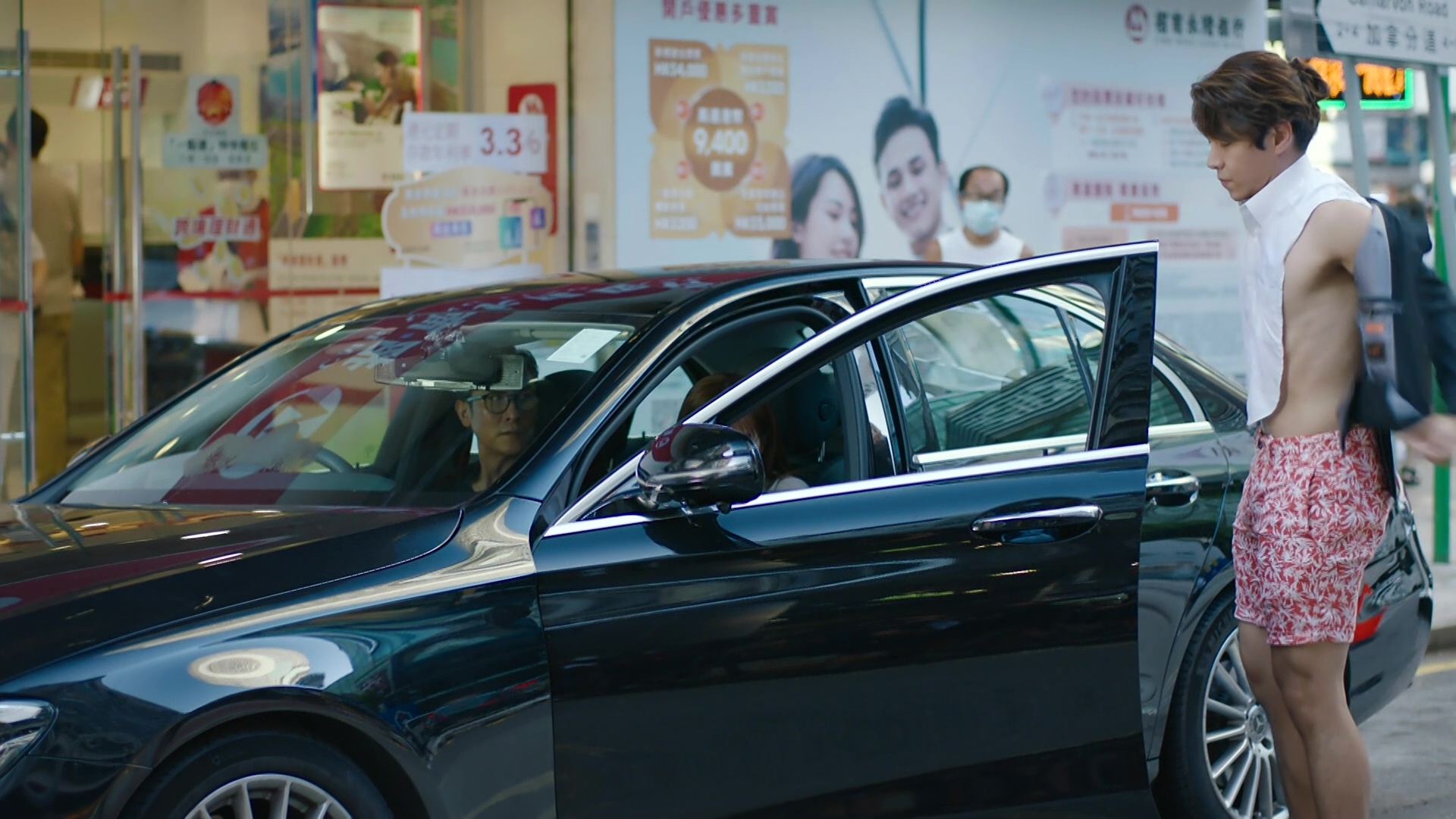 該場戲於尖沙咀街頭取景,劇情講述晴天服多了藥物感暈眩,由萬森駕車送回律師樓,並致電長勝落樓接她。現實中為怕醜仔的天宇笑言感到尷尬:「我有睇過日本嗰邊做呢類型嘅西裝,同劇情一樣方便着上身開cam進行視像會議。唔知係咪營造效果,我嗰套特別少布,見到途人有啲尷尬!」另劇集尾段,晴天喝醉失足跌落泳池,閃回當日墮崖的一段的記憶……到底戴帽黑衣人是誰呢?