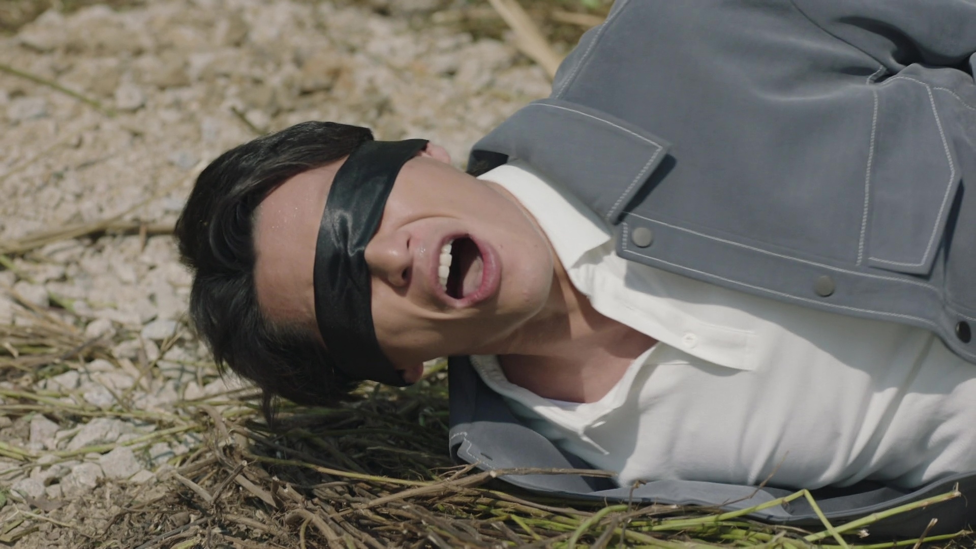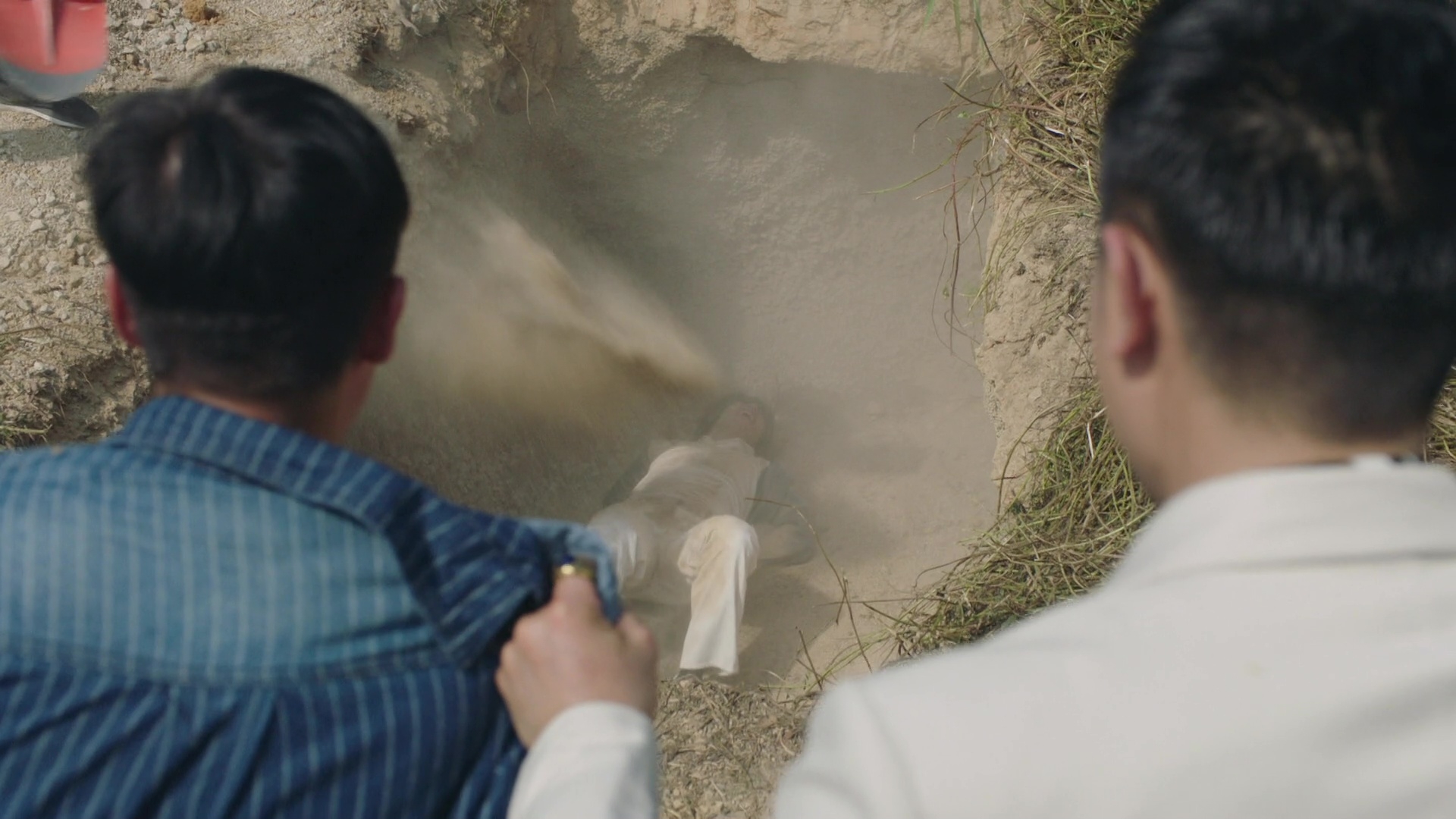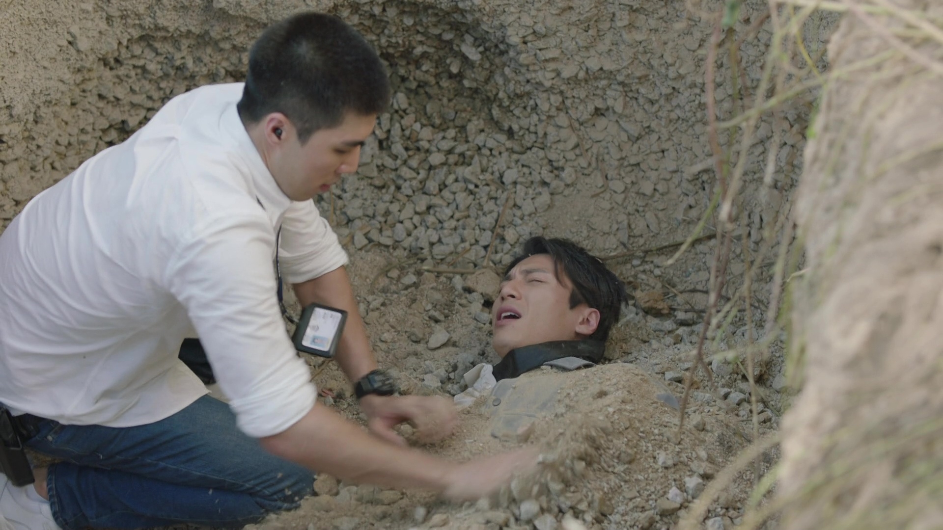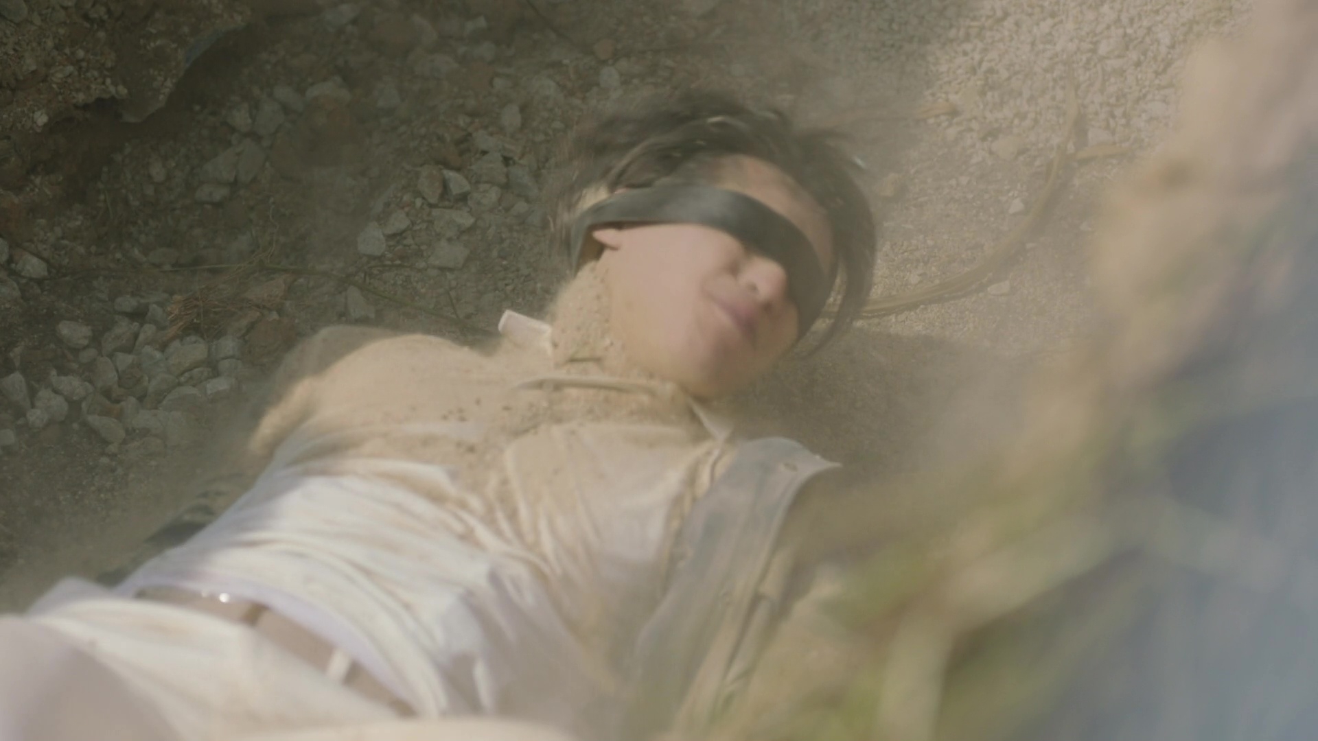 黃俊豪的被活埋場口其實相當震撼,皆因除了要被人強行拋入頗有深度的泥坑外,更全程遭人「兜口兜面」掟撥沙石,沙塵滾滾程度令黃俊豪全程眼睛未見睜開。