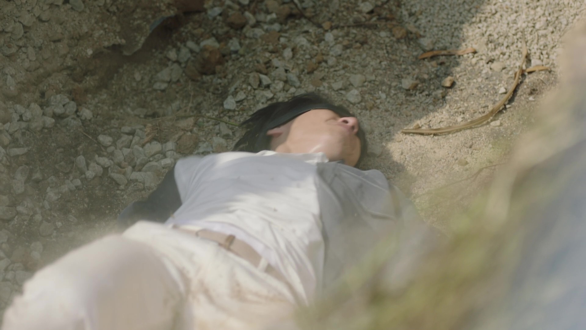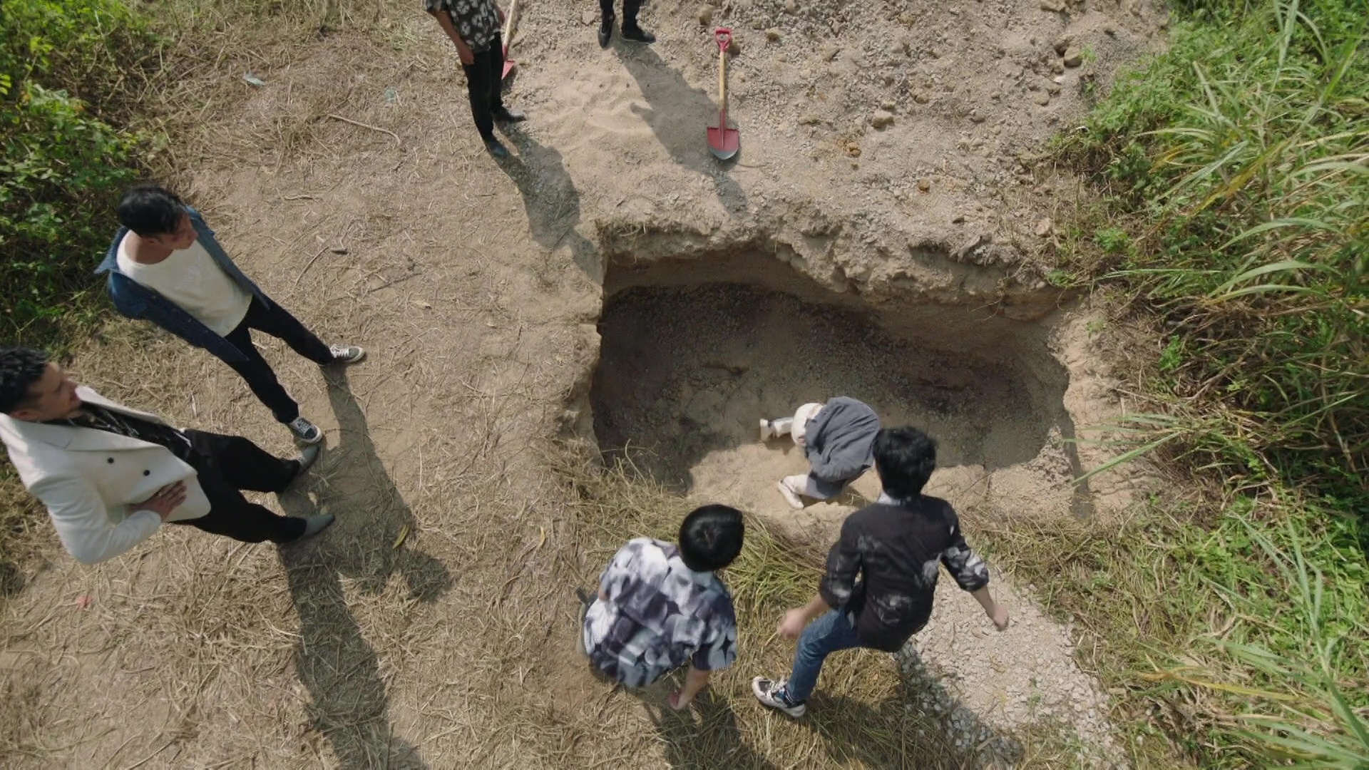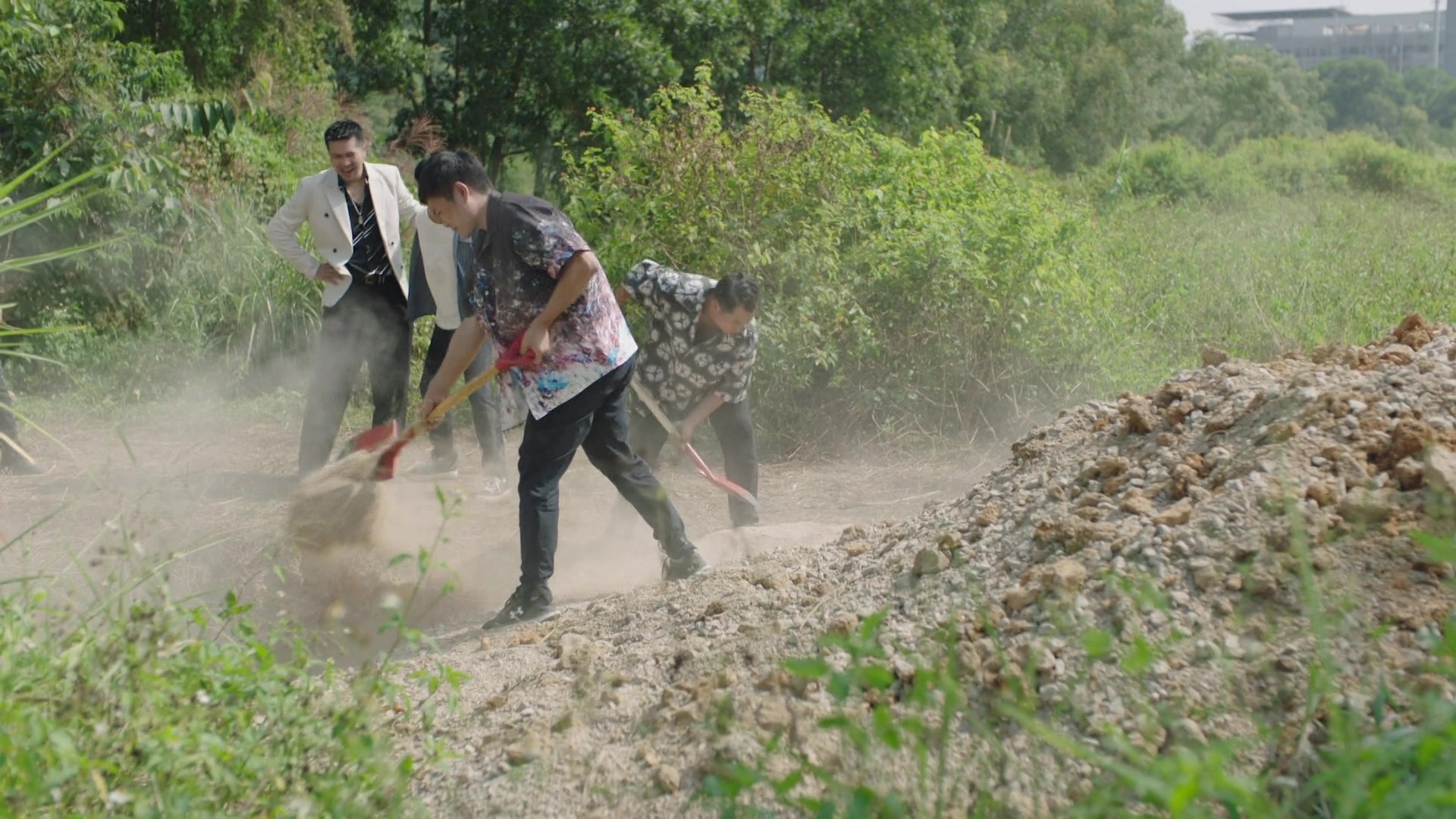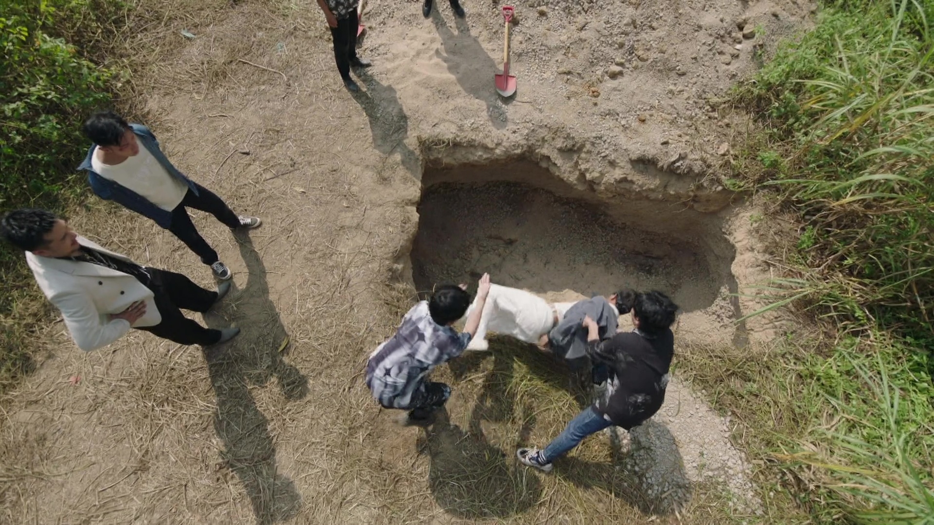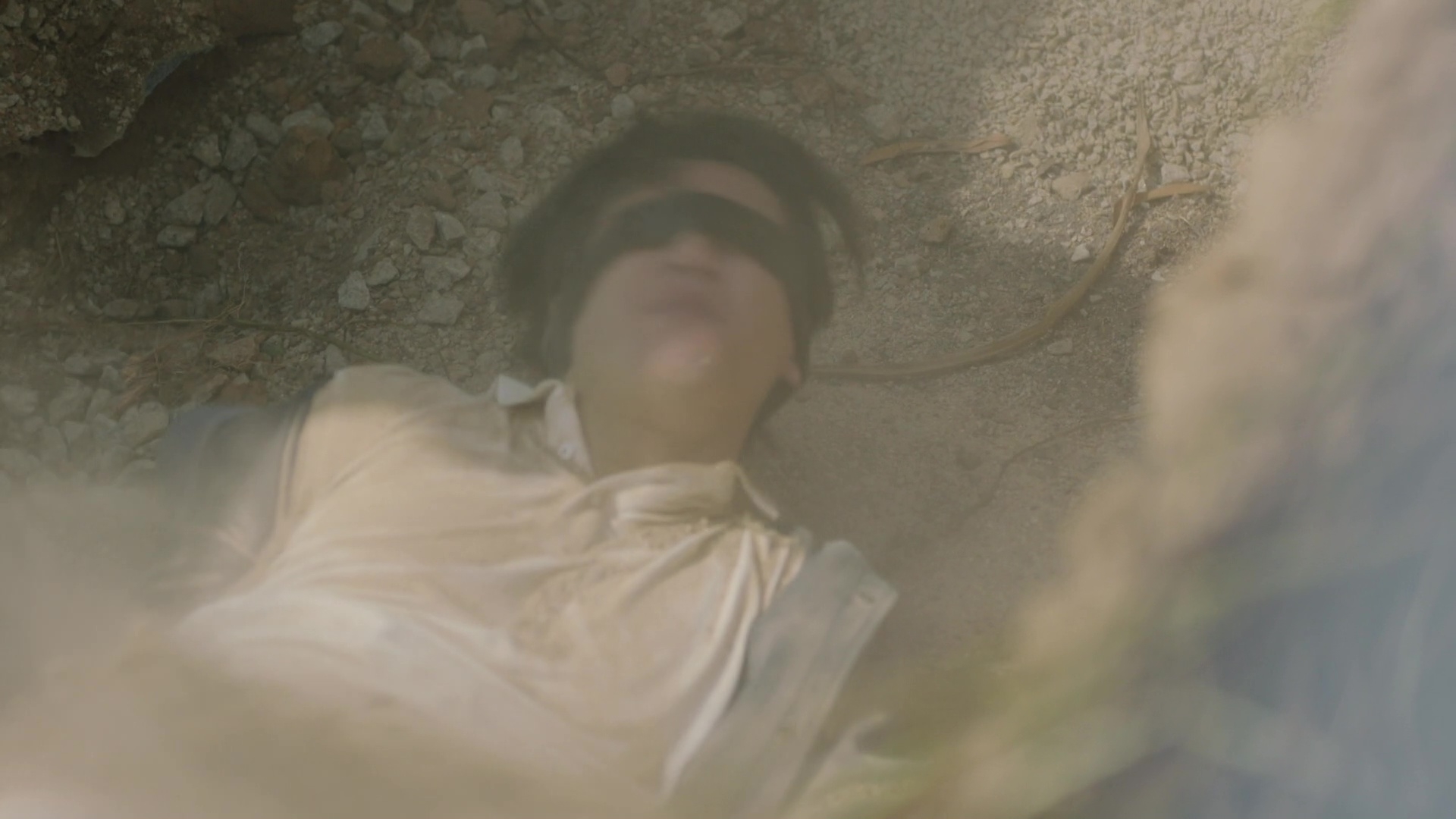 黃俊豪的被活埋場口其實相當震撼,皆因除了要被人強行拋入頗有深度的泥坑外,更全程遭人「兜口兜面」掟撥沙石,沙塵滾滾程度令黃俊豪全程眼睛未見睜開。