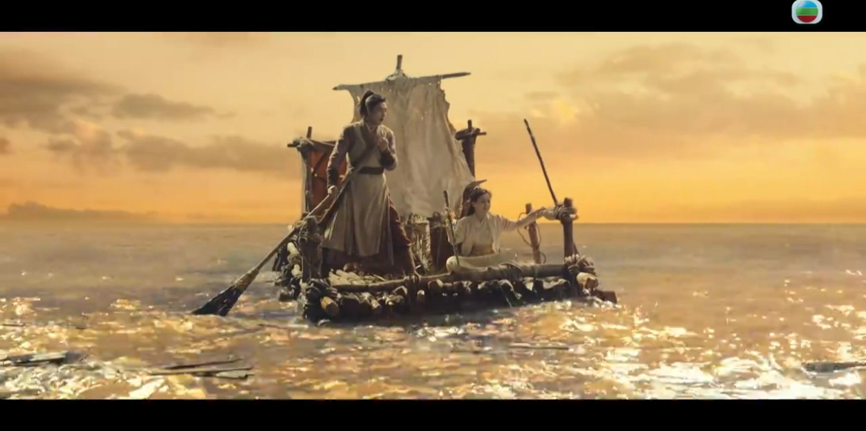 郭靖和黃蓉利用竹排挪開巨石,歐陽鋒救出歐陽克。之後歐陽鋒以洪七公要脅郭靖默寫九陰真經,又要求他砍樹造船。黃蓉和郭靖帶著洪七公乘木筏離開,途中遇上風浪,三人看到前方有大船便呼救,怎料竟遇上完顏洪烈等人。![]()