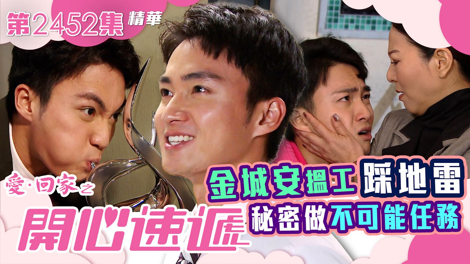 《愛回家之開心速遞》第2452集劇情講述,我哋今集嘅主角金城安(周嘉洛)又嚟啦!佢份人好食懶飛,自從喺吳旺達返嚟香港後都遊手好閒,屋企人都睇唔過眼想佢搵工!安仔居然提議屋企人介紹佢入接龍集團工作,不過成個熊家人都唔想幫佢,反而互相推搪,而媽咪熊尚善(滕麗名)更係直言要佢自食其力,自己去搵工!