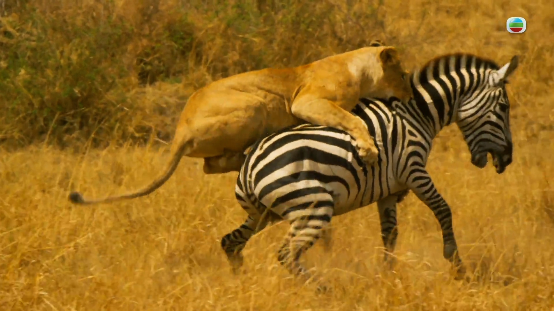 把斑馬擊倒後,劉艷正想和幼獅分享美食時,卻引來一群鬛狗爭奪。![]()