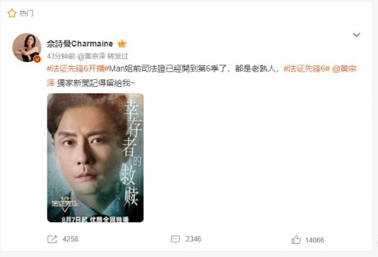 《新聞女王》總監製鍾澍佳最新作品《法證6》,昨日(7日)在優酷率先上線,值得一提的是,《法證6》的預約觀看人次,直至正式上線前已衝破333萬,打破了《新聞女王》開播時創立的100萬預約觀看人次紀錄,成為「優酷史來(有史以來)港劇預約Top1」。雖然被《法證6》打破了自己主演劇集創下的紀錄,但「Man姐」佘詩曼昨日還是落落大方地在社交網巧妙地為《法證6》宣傳造勢:「Man姐前司法證已經開到第6季了,都是老熟人」,更@男主角黃宗澤(Bosco)謂:「獨家新聞記得留給我」,因而獲封「宣傳小能手」。
