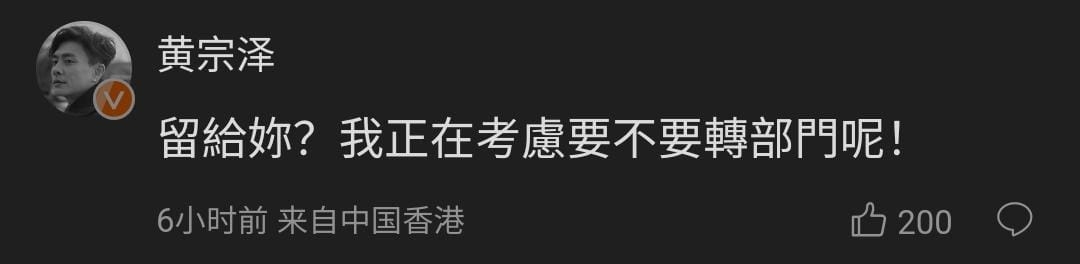 黃宗澤亦即時搞笑地回應了阿佘的幽默:「留給妳?我正在考慮要不要轉部門呢!」隨即令人聯想到黃宗澤加盟《新聞女王2》的強勢演出,再次引爆「TVB劇集宇宙」。對於阿佘與Bosco攜手宣傳、一箭雙鵰,網民無不拍手叫好,除了叫Bosco帶著《法證》下屬過檔找Man姐外,還笑言:「Bosco你有兩個選擇, 一是去SNK上班同Man姐爭做新聞國王,一是去毒品調查科同馬幗英(阿佘《法證II》角色名)並肩作戰,你鍾意哪個?」阿佘的巧妙助攻,更引發了網民對於《法證》系列的集體回憶,除紛紛表示要從第一季開始翻煲外,還揚言十分掛念阿佘當年的英勇女幹探角色:「我以為Madam Ma要回歸呢,想念破案高手Madam Ma」。