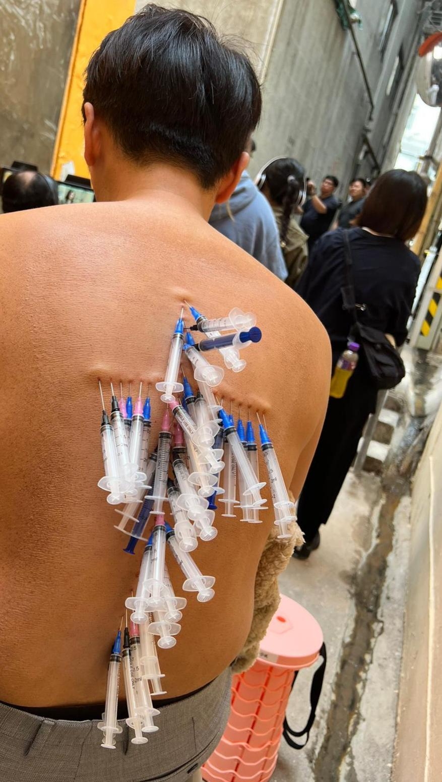 雖然Gordon插滿針筒的鏡頭只有數個兼時長只有兩、三秒,但為了做出效果,台前幕後可謂花足心思。首先劇組為Gordon準備了一塊可覆蓋整個背部的假皮,等Gordon不用直接suffer針插之苦;之後為了化好「針筒妝」,化妝同事前後足足花了四個小時為Gordon「裝身」,Gordon受訪時透露過程確實繁複:「黐完塊假皮再一支一支針慢慢拮上去,同埋學你(小編)話齋又會係咁跌出嚟,然後又要再黐過。」