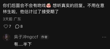 這對「魚帕CP」的最終走向,自然成為了網民討論的焦點。日前有網民在吳子冲的小紅書留言,稱自己是「魚帕CP」的忠實粉絲,因此很想知道「魚帕CP」是否會有吻戲,更笑言:「不用在意林生,他估計已經過了接受期。」吳子冲也大方回應:「有...半下」,令網民紛紛期待這對最萌身高差CP的吻戲!