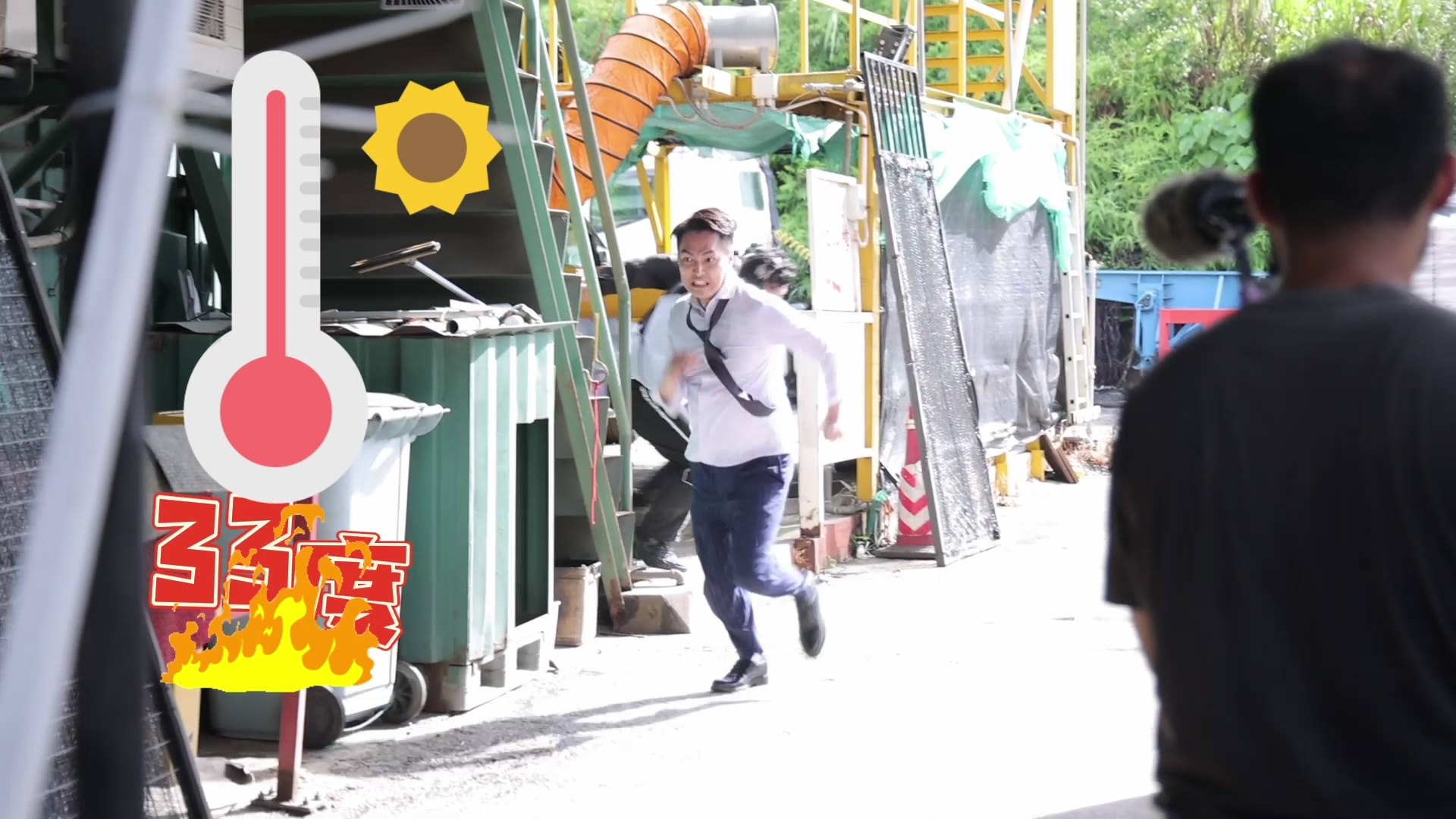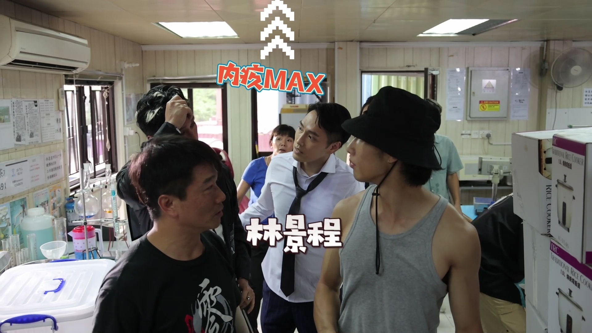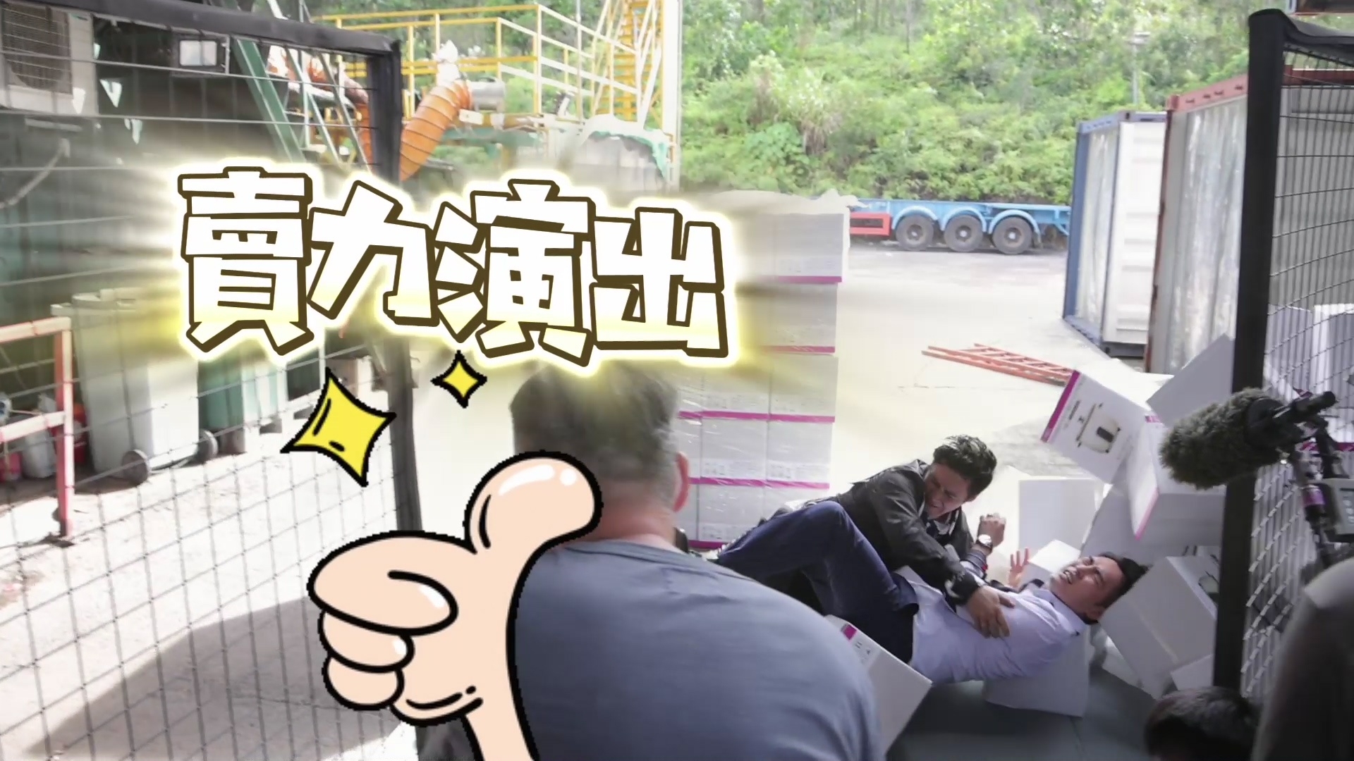 林景程與翟威廉的打鬥戲雖然只有約1分半鐘,但拍攝過程絕不簡單!官方釋出相關場口花絮片段,翟威廉拿刀揮斬景程時,屋頂其中一塊天花意外落下,並狠狠擊中威廉的額頭,幸好威廉並沒有大礙,休息一會便重新投入拍攝,非常專業。拍攝當日正值33度高溫,穿着長袖的兩人不但要奪命狂奔,還要瘋狂埋身肉搏,兩人賣力演出拍到身水身汗,認真唔簡單。![]()