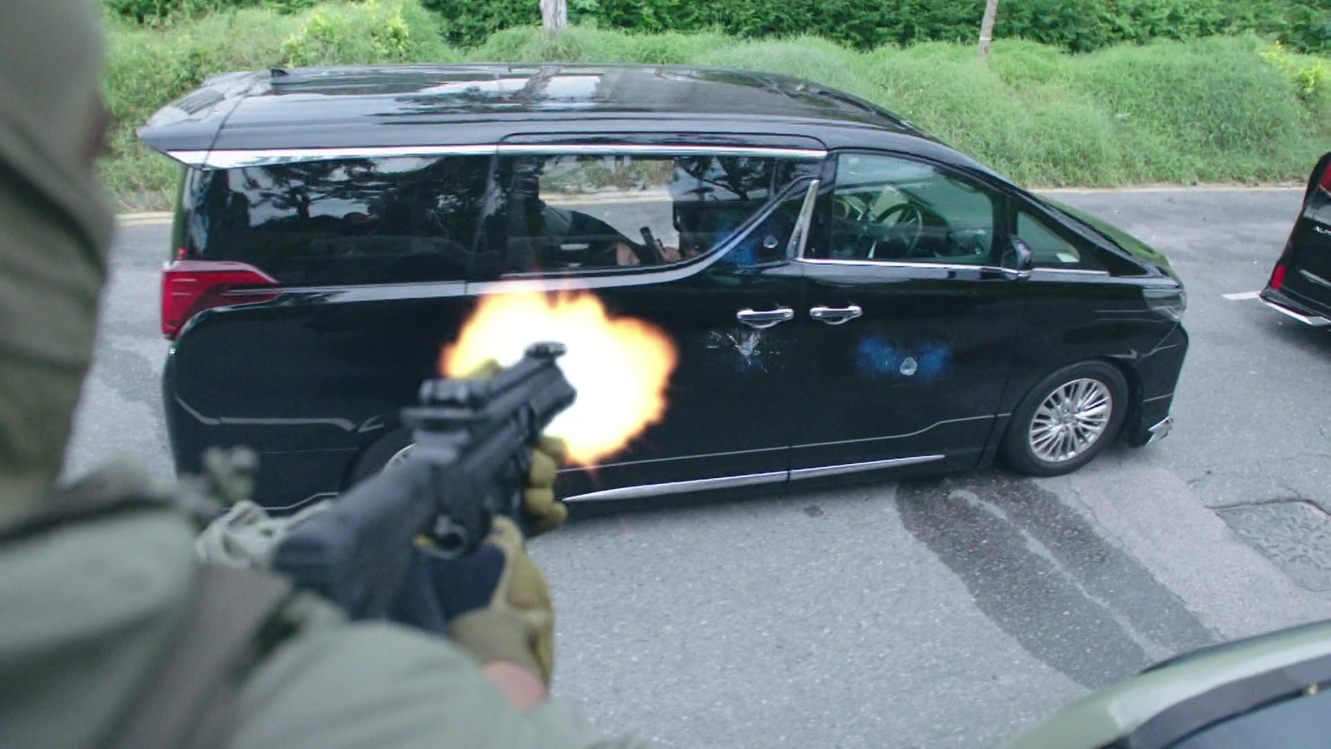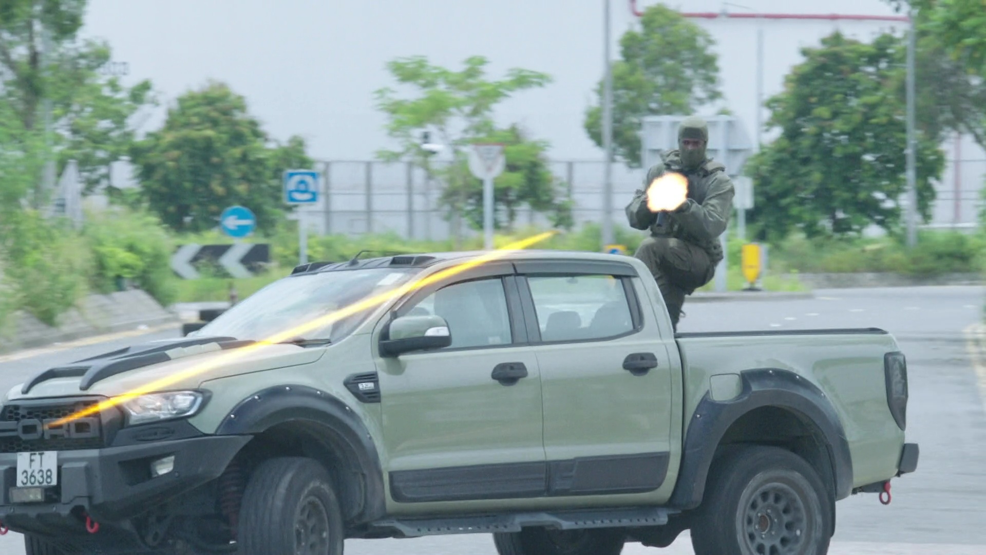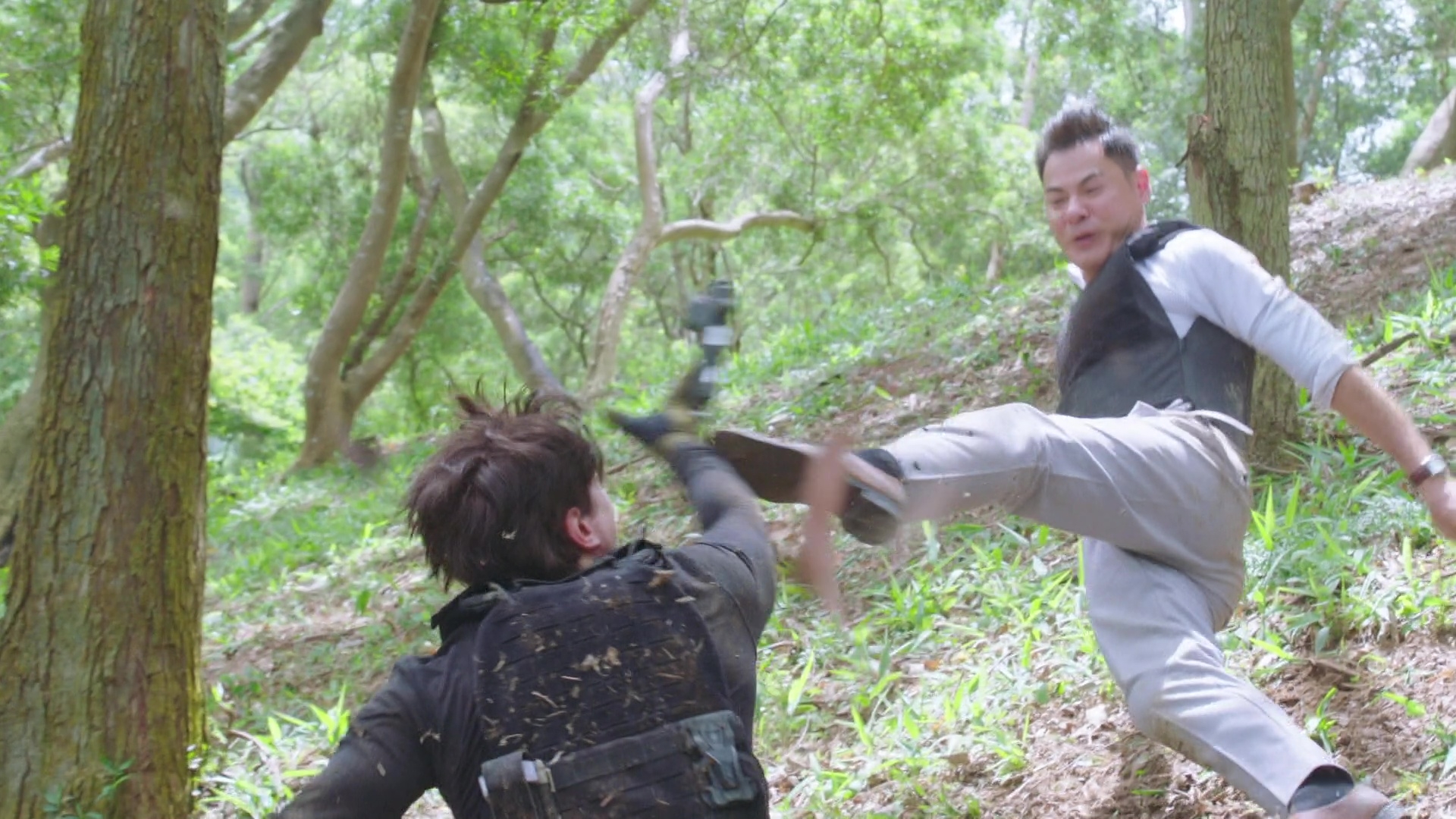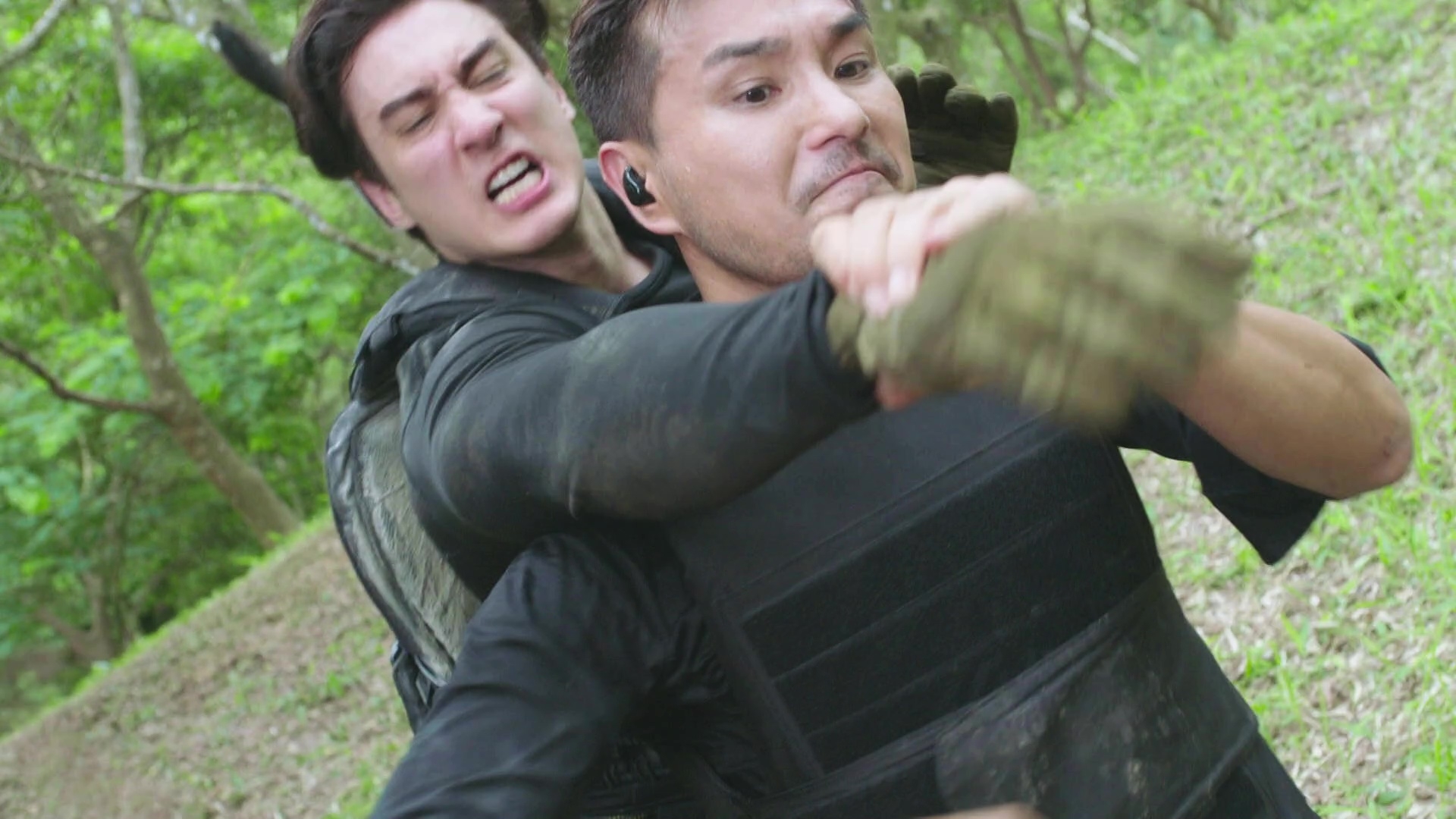而陳展鵬(煎Pan)在槍戰及樹林追逐戰兩大場口均表現出色,除了要不斷「擒高擒低」,更要做出單手凌空飛躍車頭冚後開槍動作、單手型格換子彈匣、在斜坡上肉搏滾地沙兼大腳趷起,及捐褲浪以飛腳勾跌對手等,每個鏡頭齋睇都感到吃力,煎Pan亦明顯全程拍到滿頭大汗。據知相關場口拍攝接近一星期、台前幕後動員超過200人,製作費更高達7位數!以5分鐘的電視製作而言,已算是「天價」級製作,相當有誠意!