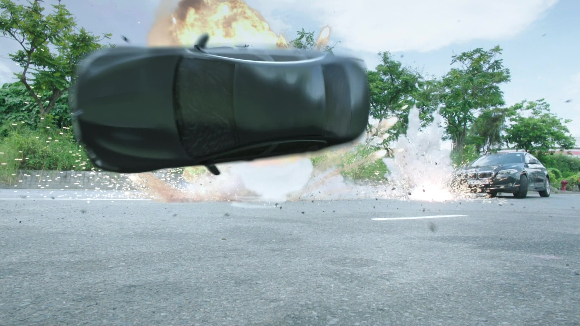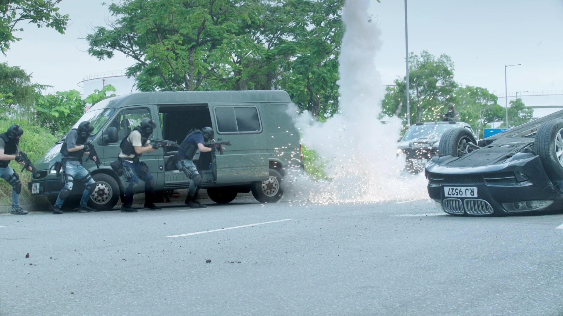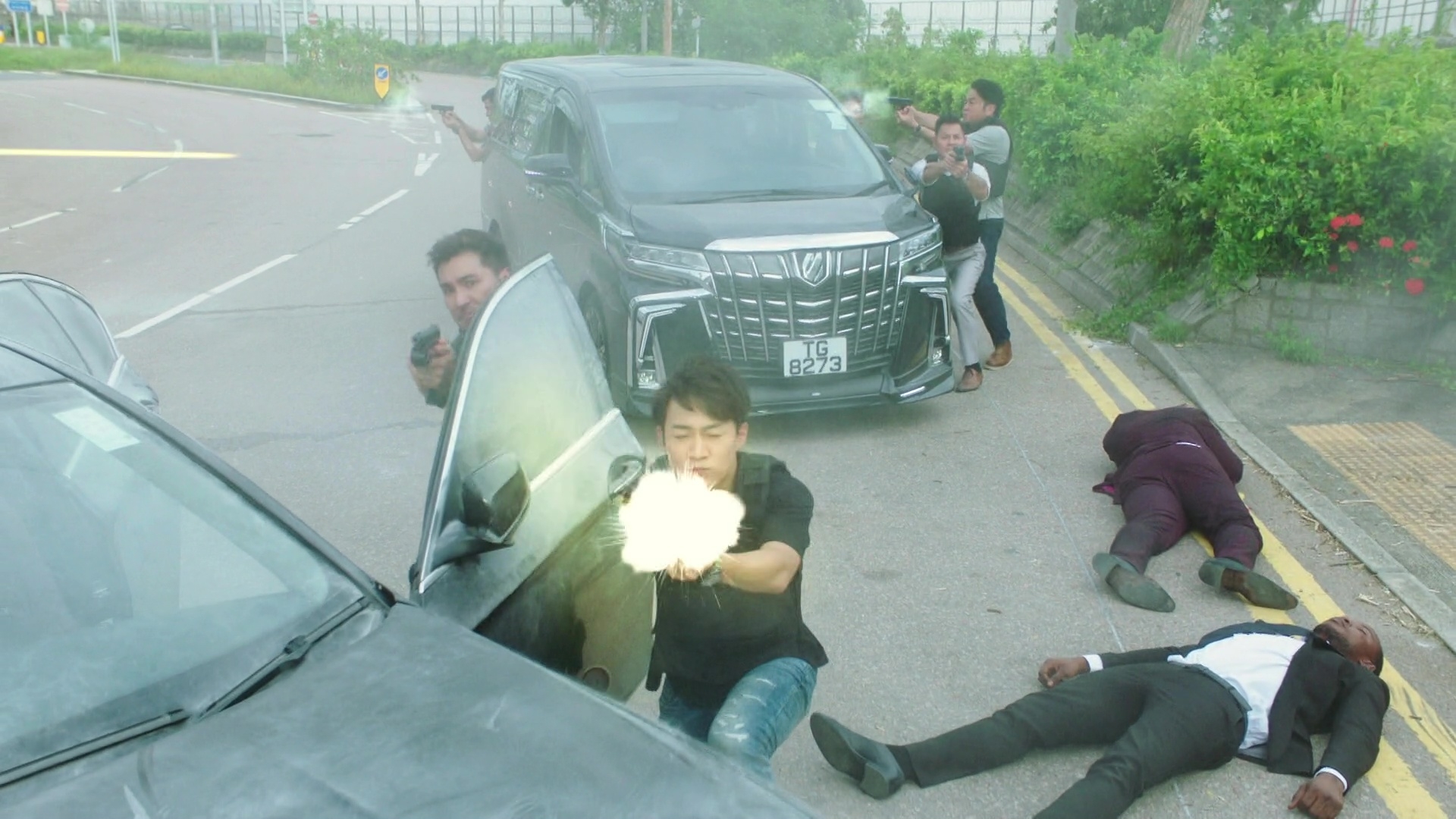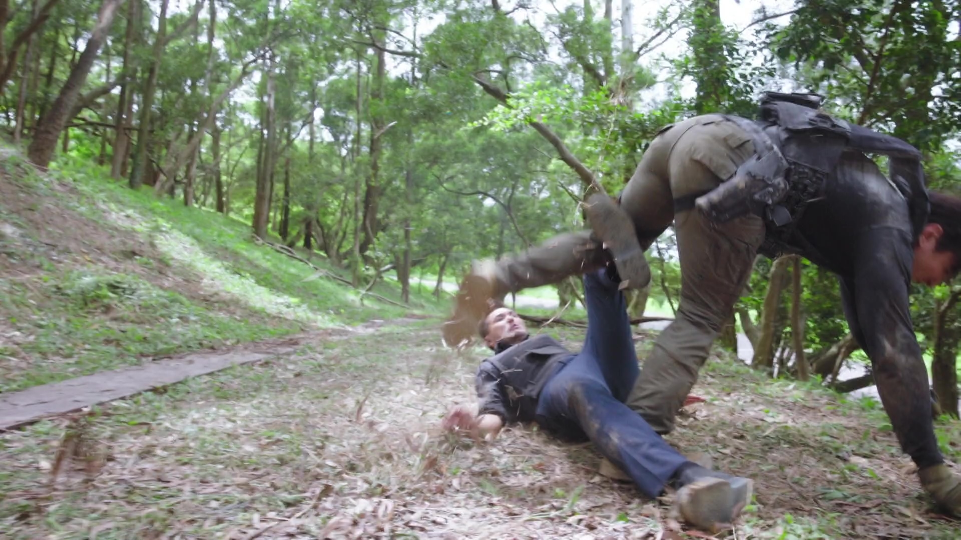 而陳展鵬(煎Pan)在槍戰及樹林追逐戰兩大場口均表現出色,除了要不斷「擒高擒低」,更要做出單手凌空飛躍車頭冚後開槍動作、單手型格換子彈匣、在斜坡上肉搏滾地沙兼大腳趷起,及捐褲浪以飛腳勾跌對手等,每個鏡頭齋睇都感到吃力,煎Pan亦明顯全程拍到滿頭大汗。據知相關場口拍攝接近一星期、台前幕後動員超過200人,製作費更高達7位數!以5分鐘的電視製作而言,已算是「天價」級製作,相當有誠意!