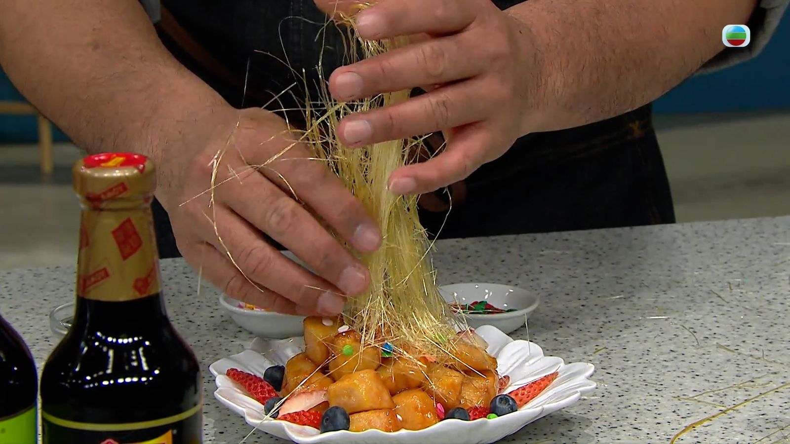 材料:火雞 300克,士多啤梨 2粒,藍莓 約10粒,砂糖(拔絲用) 200克,糖霜 1茶匙,冰粒 600克