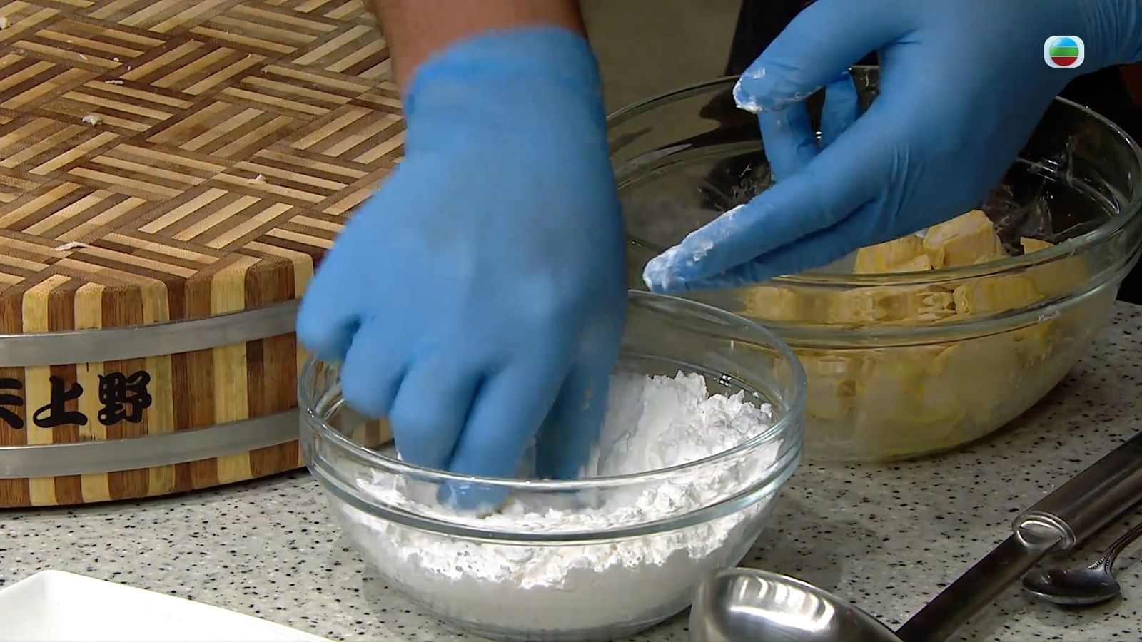 加少許鹽,俾少許底味它。再加吉士粉,吉士粉令它有少許蛋香味,炸起來顏色更好睇。