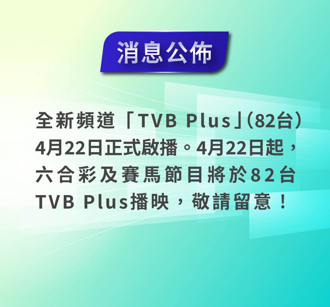 全新頻道「TVB Plus」(82台)4月22日正式啟播。4月22日起,六合彩及賽馬節目將於82台TVB Plus播映,敬請留意!