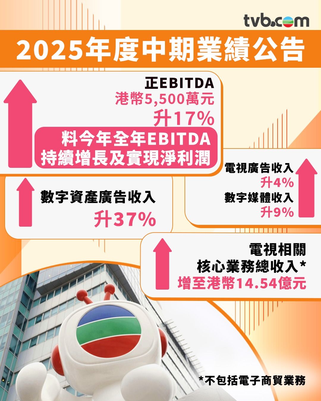 本集團期內與電視相關的核心業務(不包括電子商貿業務)的總收入由港幣 14.45 億元增加港幣 900 萬元或 1%至港幣 14.54 億元,主要由於電視廣播分部的廣告客戶 收入增長 4%及數字媒體分部的收入增長 9%所致。期內的 EBITDA 為港幣 5,500 萬 元,較二零二四年同期改善港幣 800 萬元或 17%。期內本公司股東應佔虧損為港幣 1.08 億元,較去年同期的虧損港幣 1.43 億元減少港幣 3,500 萬元。