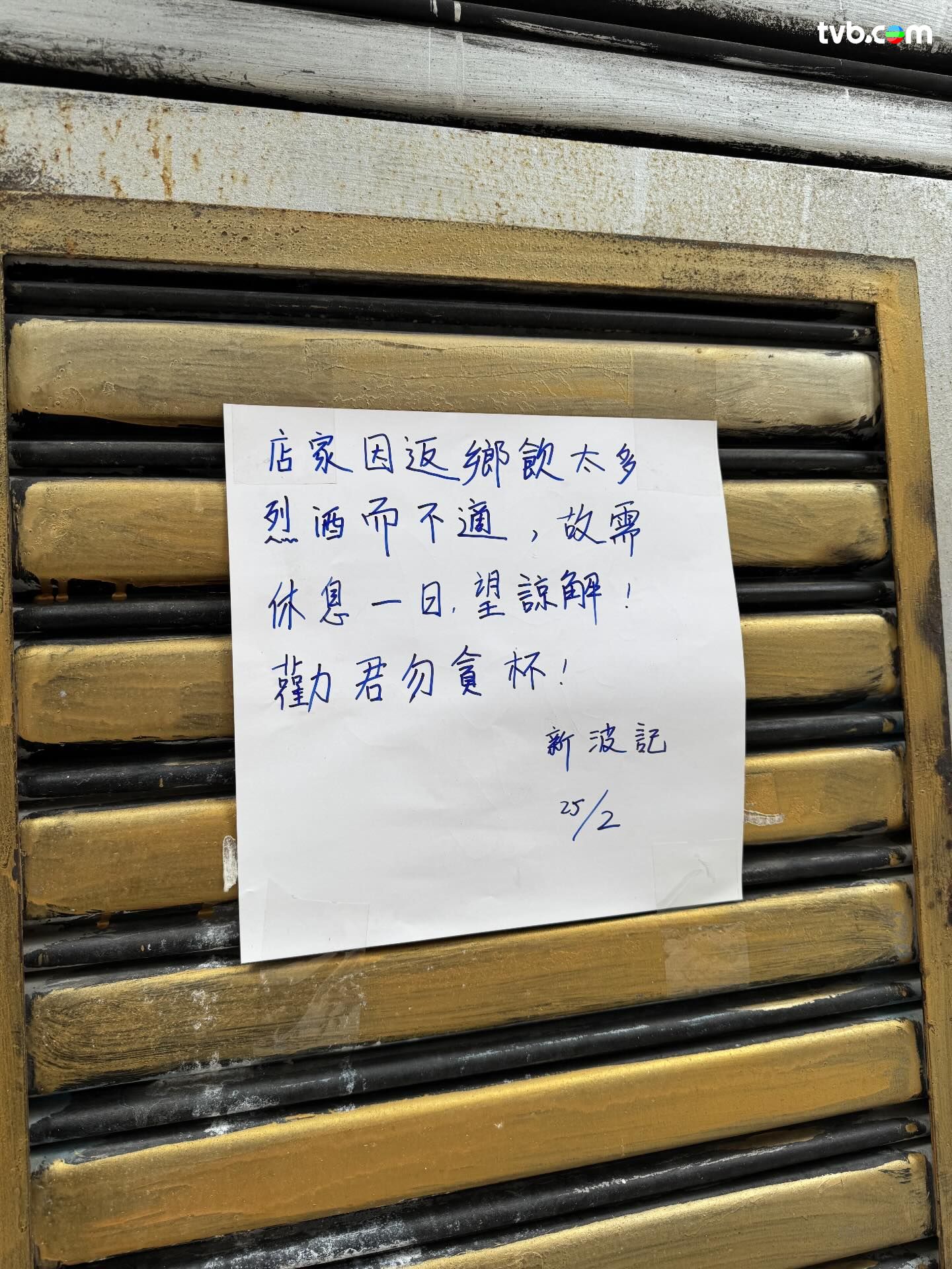 近日有網民上載上環某餐廳的休業告示!相中可見,該餐廳拉下鐵閘,並貼出一張手寫告示,寫道:「店家因返鄉飲太多,引致不適,故停休息一日。望諒解!勸君勿貪杯。」樓主在貼文中亦不禁笑言:「想知飲咩酒咁勁,可以宿醉兩日唔開門做生意!」