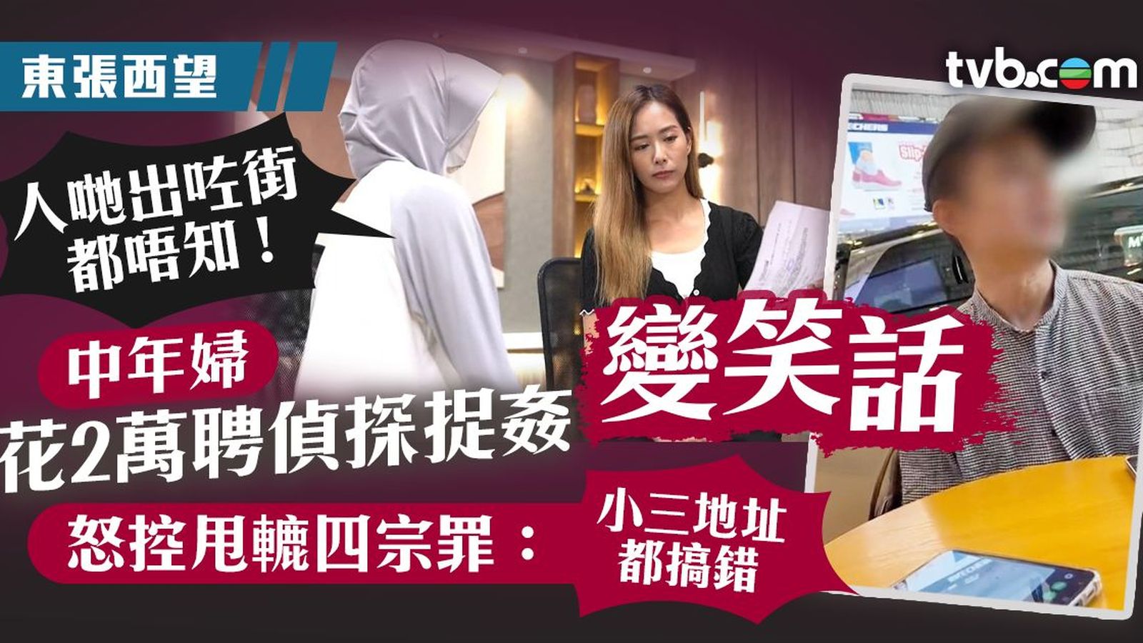 《東張西望》今集事主陳女士懷疑丈夫金屋藏嬌,為查出真相,她傾盡家財,籌集約18000元委托私家偵探張先生幫她跟蹤調查丈夫跟小三。