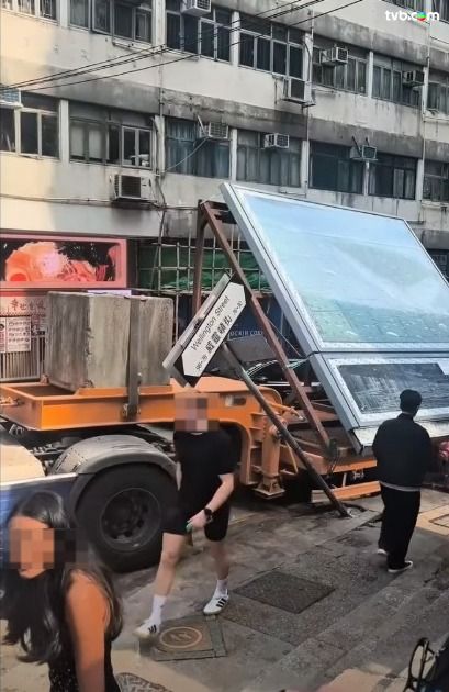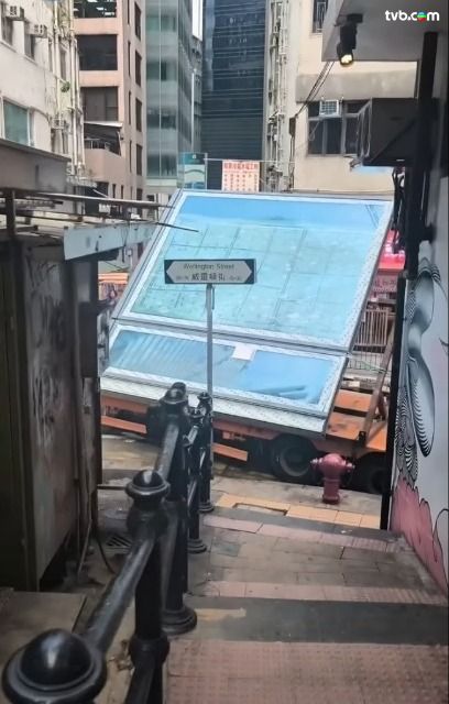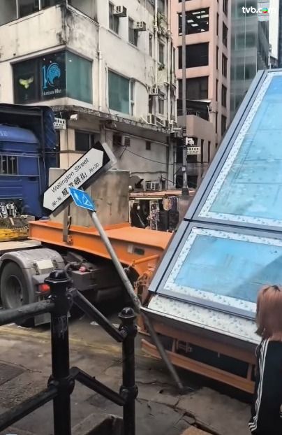 中環威靈頓街驚現「全新打卡位」?有網民貼出影片,直擊一輛大型貨車懷疑誤闖窄路,畫面可見貨車尾端擺住巨型玻璃,更達後方大廈一樓的高度;貨車強行通過窄路時,更不慎撞向路邊,令附近「威靈頓街」路牌,慘被撞至嚴重傾斜變形,期間更有路人高呼,場面相當驚險!