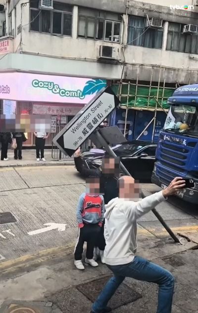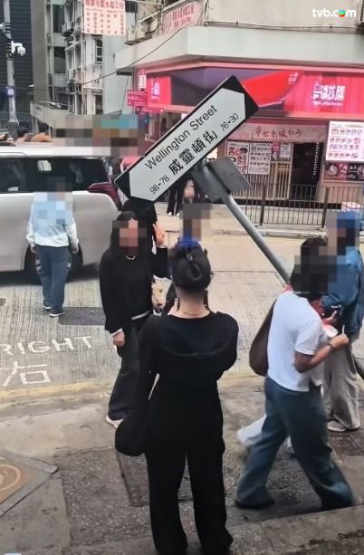 而被撞至傾斜變形的「威靈頓街」路牌,更成為全新的打卡位,不少路人事後皆前往影相。樓主亦在帖文形容「揸咁大部車入窄路,成就全新景點(好在係撞柱唔係撞人)!」