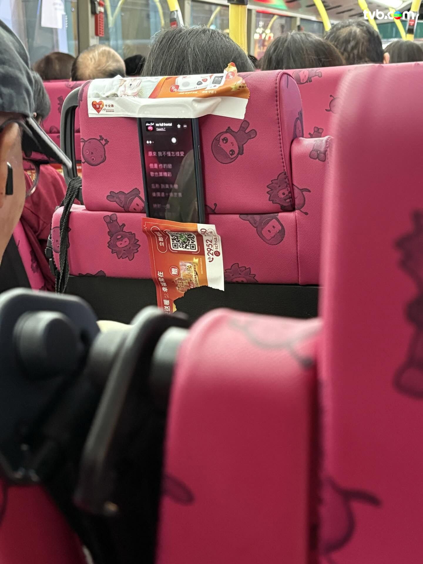 近日網絡流傳九巴車廂相片,可見有乘客為了騰出雙手玩手機,竟擅自撕下前方座椅背後的廣告貼紙,並分成兩半,利用貼紙的黏性將手機直接「黏」在椅背上,充當「手機架」。樓主不禁在貼文言道:「原來可以咁樣自製手機架,又學到野!」