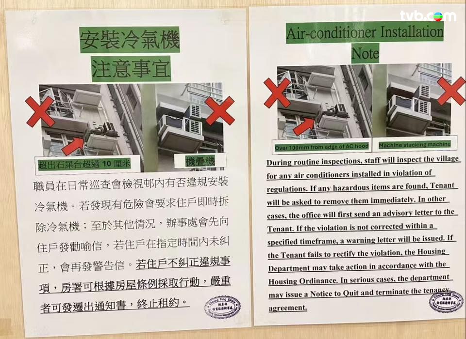 有公屋住戶發帖,就公屋兩種冷氣機安裝方案徵詢意見「你們會選擇 1 或 2?」照片可見,「方案一」採用獨特的上下堆疊方式,將一大一細的窗口式冷氣機安裝於同一窗位;而「方案二」則將兩部分體式冷氣的室外機並排安置於支撐架上,然而兩機之間不但未有預留散熱空隙,機身更有一半以上處於懸空狀態,其安全性及散熱效能則受到質疑!