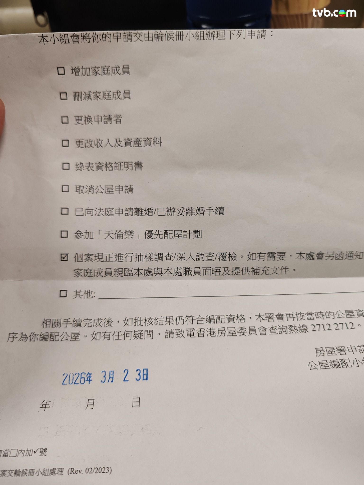 網民紛紛留言派定心丸:「申請到邊個階段都有機會中抽查」、「之前我夠唔夠一星期,又寄信黎話查完」、「咪擔心咁多,好多時都會抽查」;「海外及內地資產都會查的」、「入住半年都會覆查」、「派咗兩次都收到呢封信,等咗四個月啦未仲未有消息,仲等配房上樓」、「只要你申請嘅時候提供嘅資料係真確,點樣查都冇問題」。