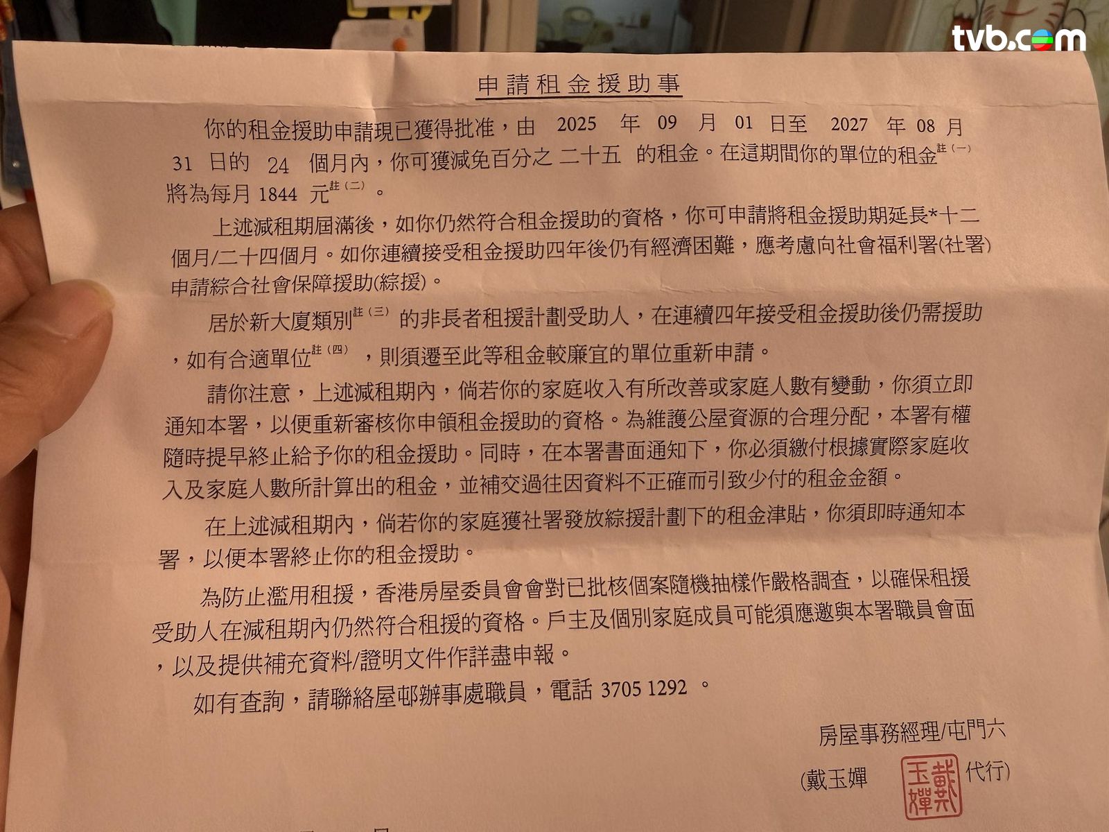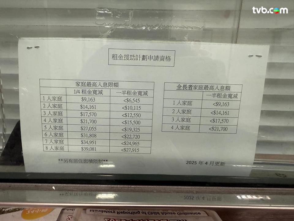 有網民發帖表示,指其現居屯門菁田邨,約35平方米單位的四人家庭,樓主指因「呢排收入唔穩定,一個月收入少過2萬」兼且「只有我返工,老婆要湊2個小朋友」,經查詢房署網站後發現「原來可以申請公屋援助計劃」,樓主九月初向屋邨辦事處主任申請,上月底收到批核通知,成功獲批減租四分之一,未來兩年租金將由每月$2,458減至$1,844。