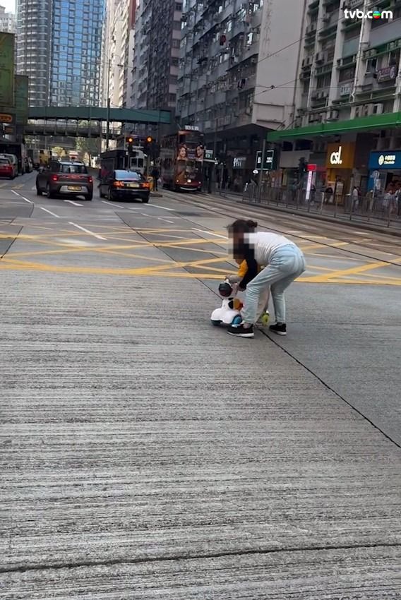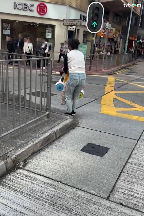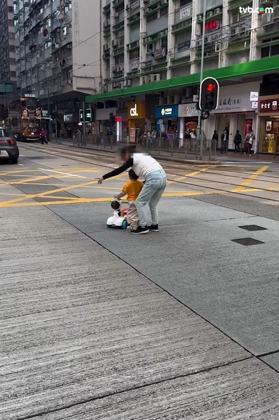 馬路如虎口!近日有網民分享片段,事發於周一(15日)中午時份,車主駛經英皇道近炮台山道交界,當等待紅綠燈時,竟目擊前方一名外傭姐姐推著坐於騎行車上的幼童,不但未有在行人路等候,反而企在馬路口邊緣位置,甚至在轉紅燈之際,仍在路中心慢條斯理「連人帶車」抬起幼童上行人路,場面極度驚險。拍片司機見狀不禁多次肉緊大叫「Very Bad!Very Bad!小心呀姐姐!」