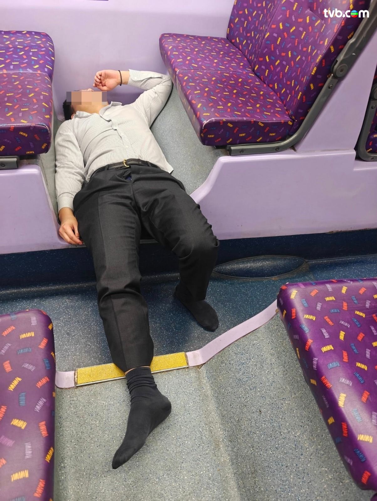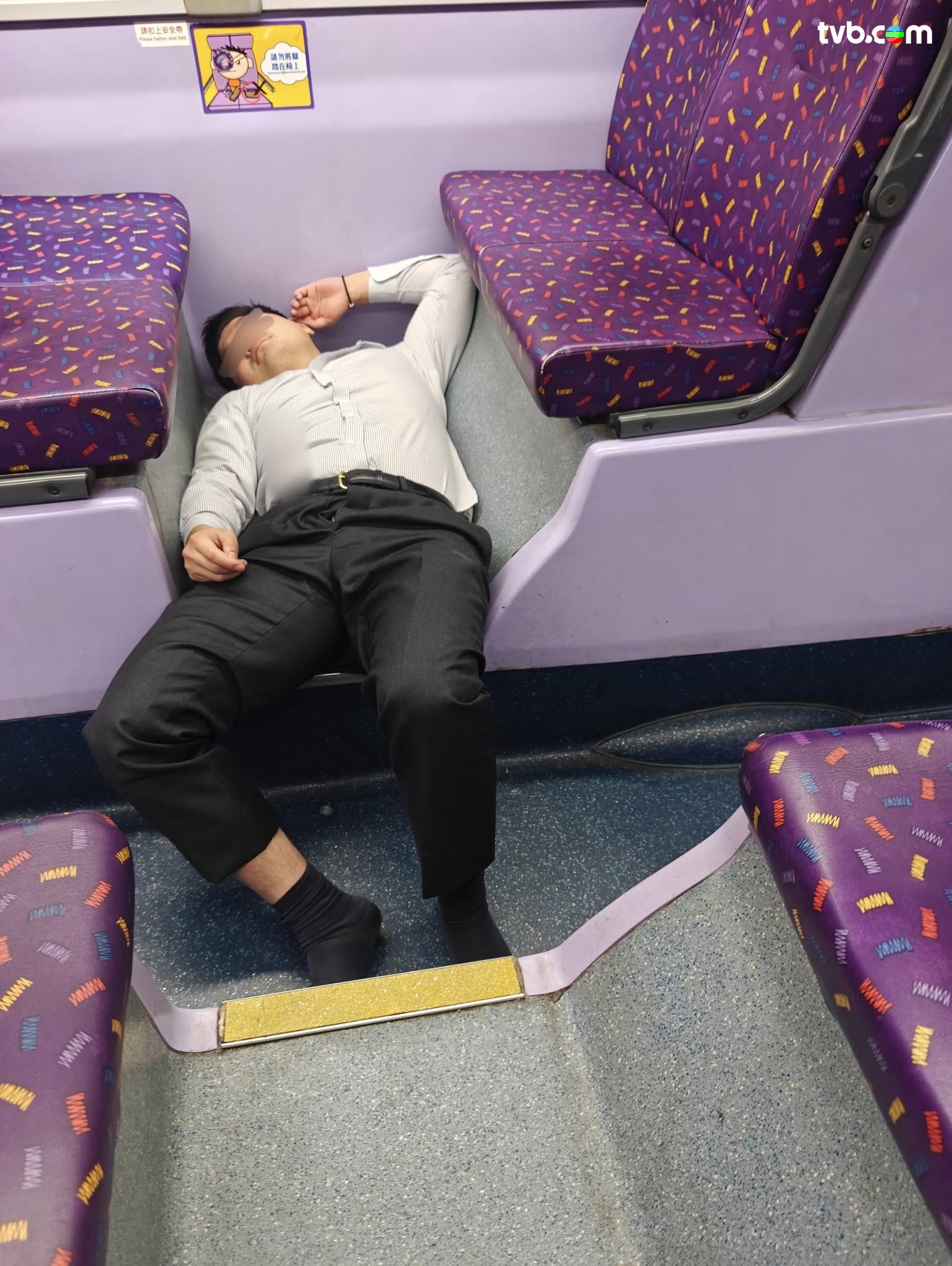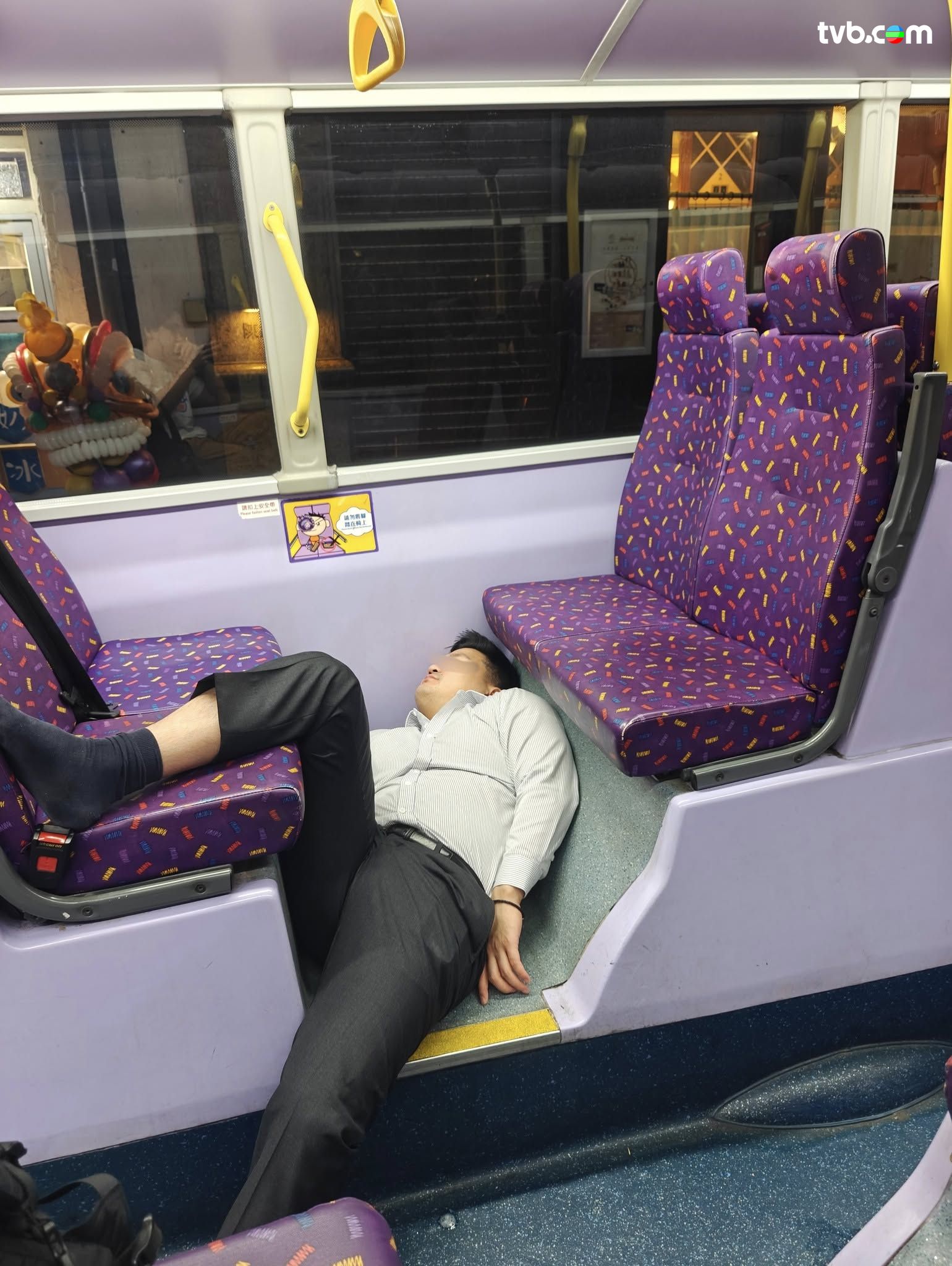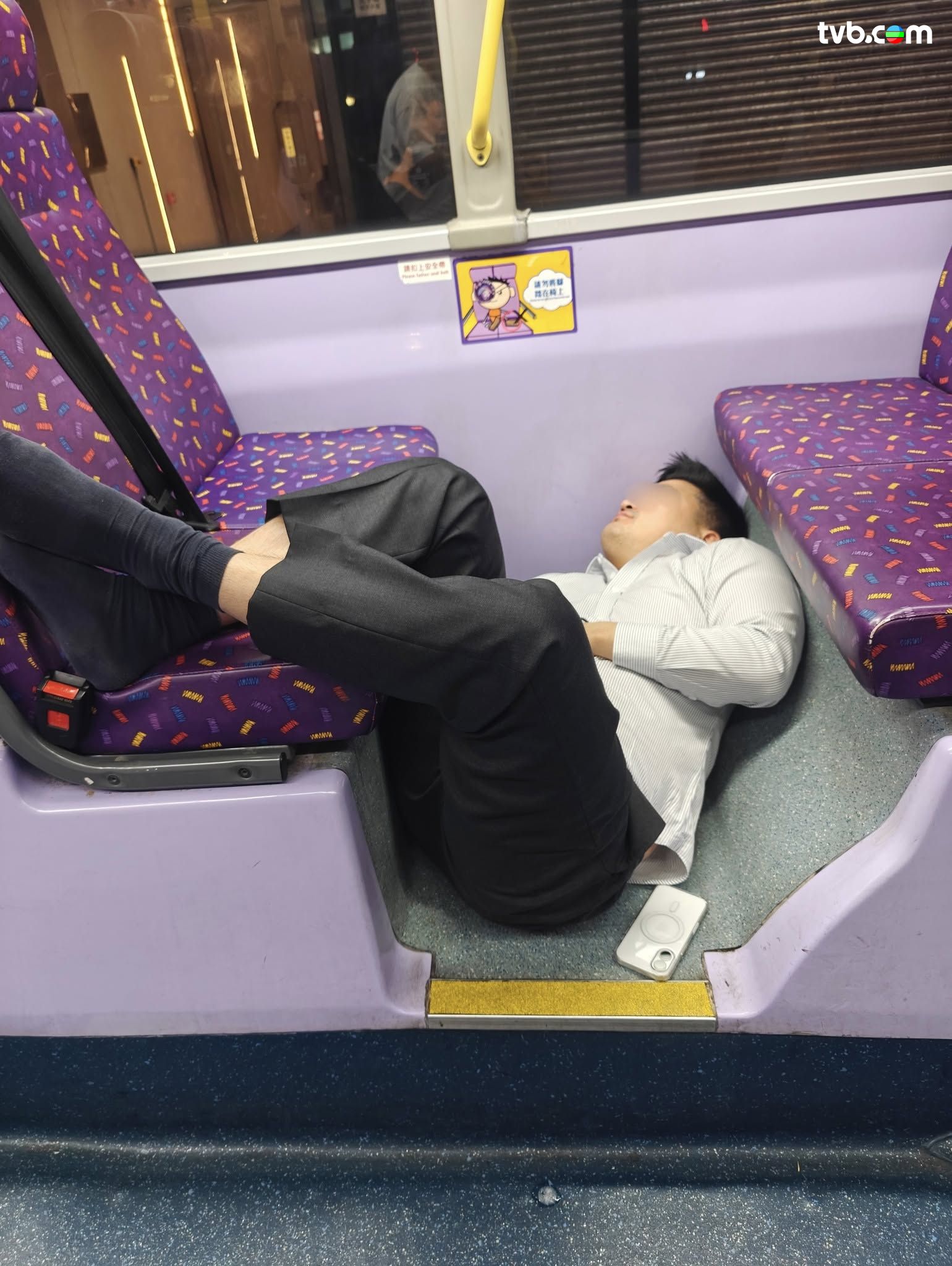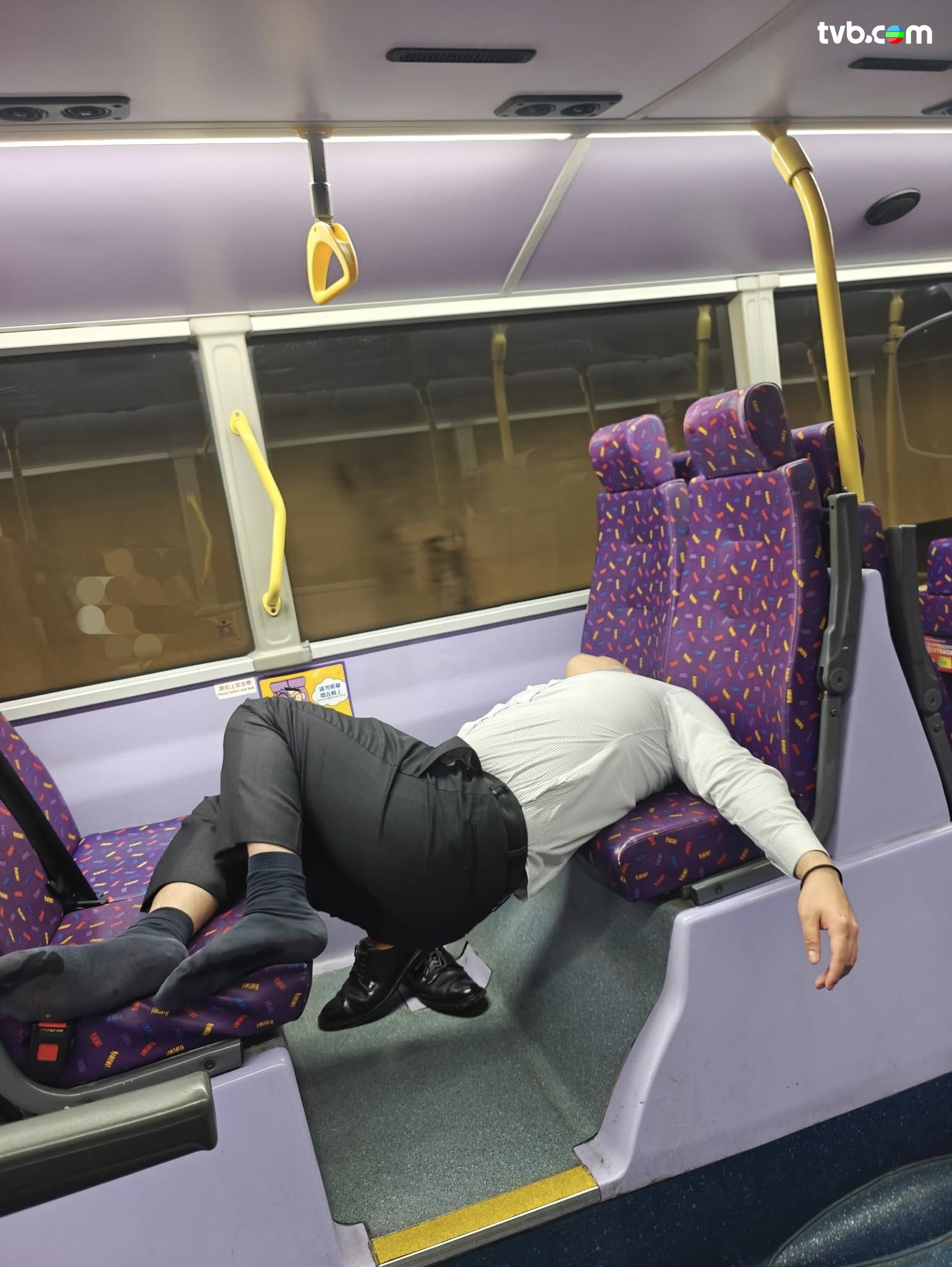 有網民日前( 11日)分享,指其乘搭城巴101號巴士時,竟然撞正西裝男疑似飲醉酒,擺出令人稱奇的睡姿。圖片可見,西裝男已經除去皮鞋,初時雙腳放在對面的座位,頭顱攤在後邊一排,之後疑似不慎滑倒,僅得一隻腳放在對面的座位;之後西裝男「再下一城」,索性整個人睡在巴士地上,雖然過程動作多多,但西裝男依然昏昏欲睡,樓主亦以「Completely hangovered」形容西裝男!