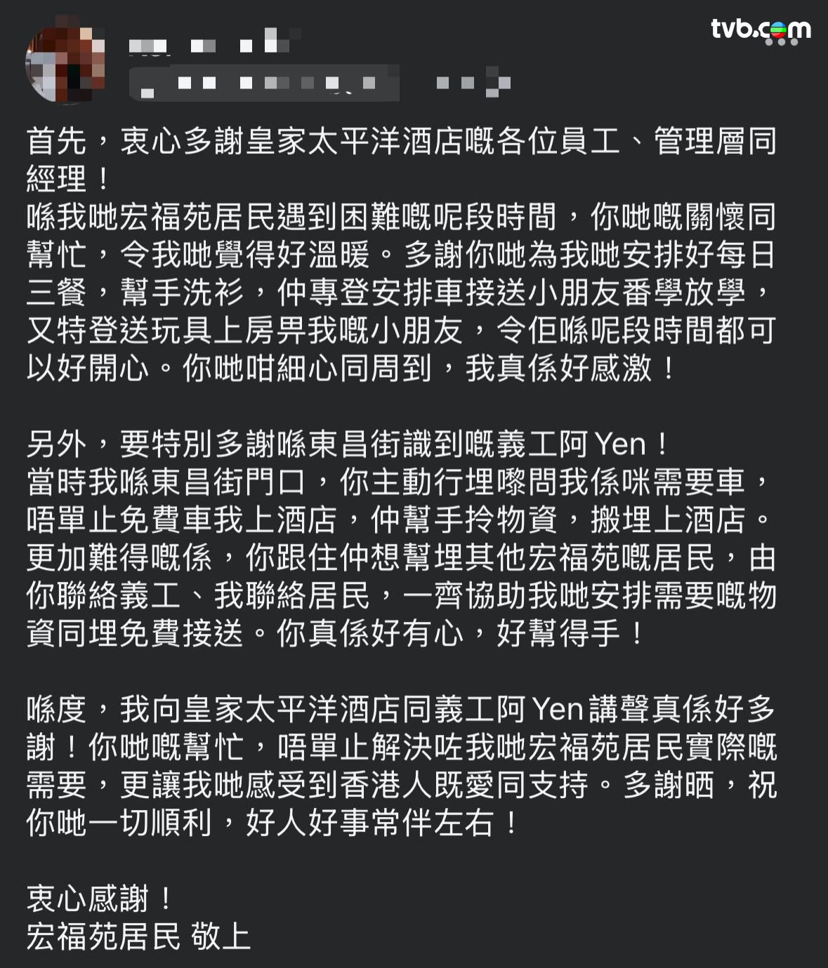 一名宏福苑災民發文指,火災後他獲安排入住皇家太平洋酒店,樓主獲酒店員工悉心照顧,故心存謝意發文「多謝皇家太平洋酒店嘅各位員工、管理層同經理」;樓主指火災後的困難時期,酒店員工照顧非常細心,他指員工「為我哋安排好每日三餐,幫手洗衫,仲專登安排車接送小朋友番學放學,又特登送玩具上房畀我嘅小朋友」,樓主直言「你哋咁細心同周到,我真係好感激!」