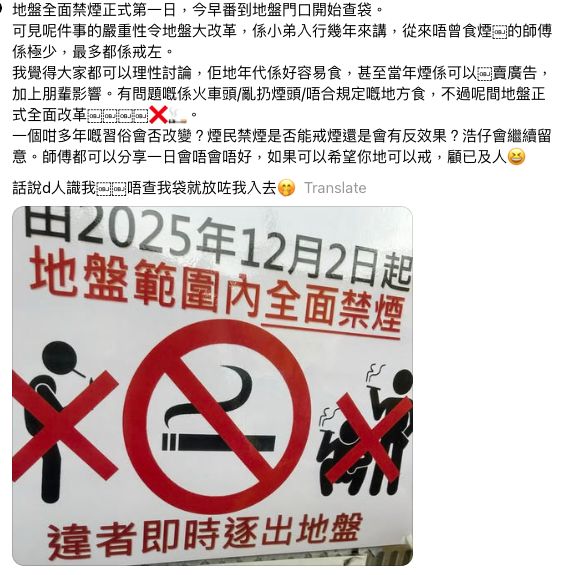 另有做地盤的網民分享實施禁煙令首日情況,他上載在地盤張貼的通告,上面寫着「違者即時逐出地盤」,他留言:「盤全面禁煙正式第一日,今早返到地盤門口開始查袋。」樓主指就連火機都不準帶入內。樓主大嘆「呢件事的嚴重性令地盤大改革」,並說:「個咁多年嘅習俗(慣)會否改變?煙民禁煙是否能戒煙還是會有反效果?」
