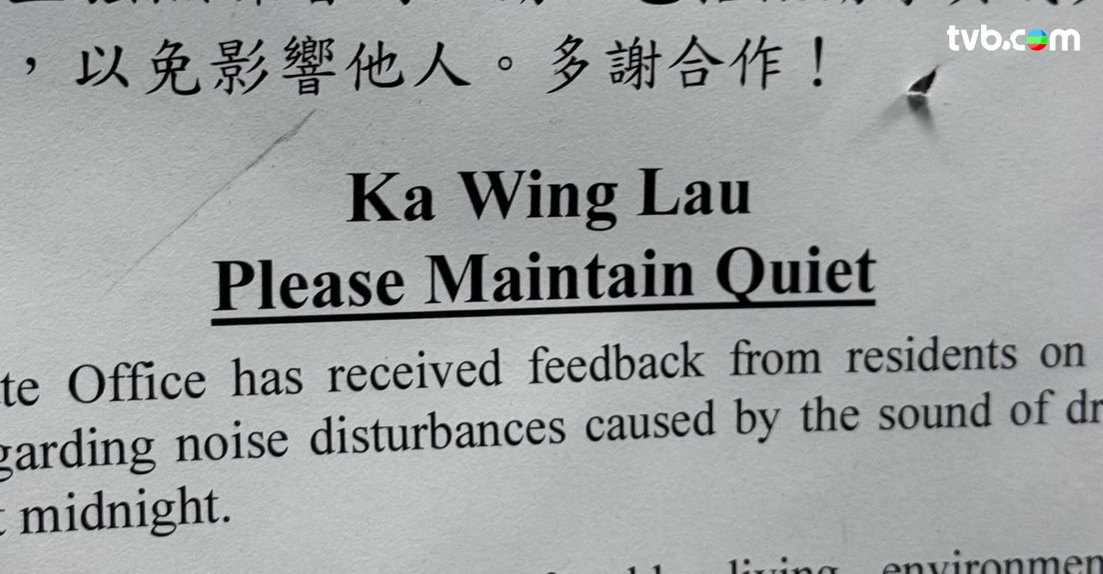有網民近日分享一則通告引起熱議!上載照片可見,某大廈張貼了一張英文通告,上面寫着「Ka Wing Lau Please maintain Quiet」,彷彿是點名要求一位名叫「Ka Wing Lau」的住戶保持安靜,令樓主大感疑惑!其後才揭曉真相,原來「Ka Wing Lau」並非住客姓名,而是家維邨家榮樓(Ka Wing Lau)的英文標示,管理處只是提醒整座大樓住戶留意噪音問題。