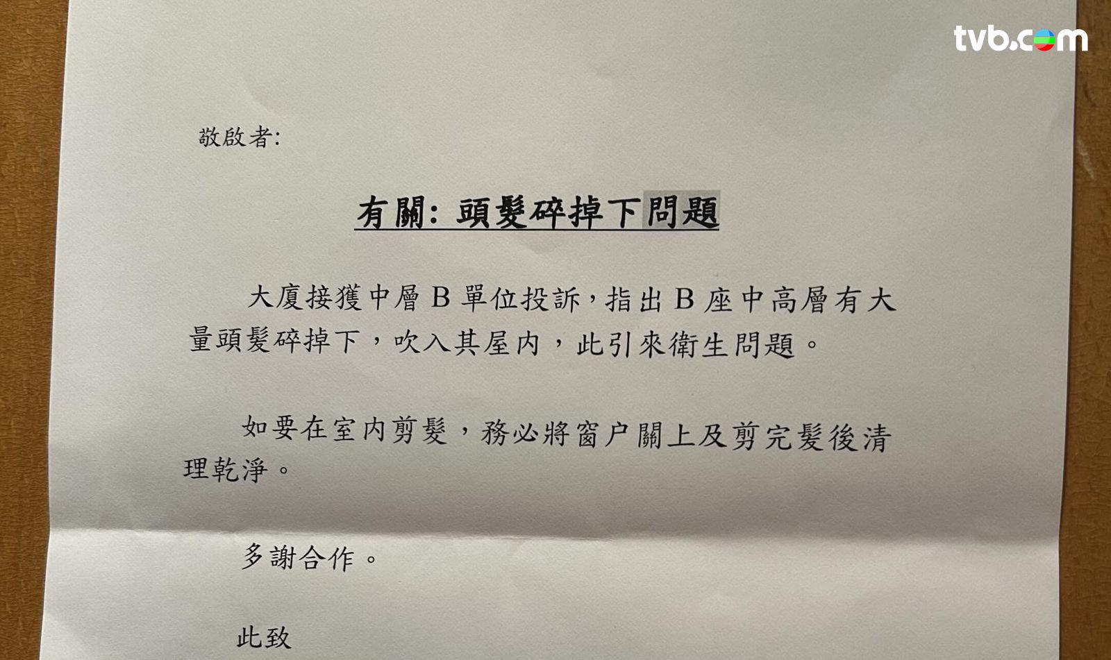 有網民分享有趣的大廈公告,通告指接獲同一棟大廈住戶投訴,始終高層單位有大量頭髮碎掉下,不慎吹入屋內,搞到惹來衛生問題!通告還呼籲住戶剪頭髮記得要關窗,事後還要清理乾淨,非常搞笑!樓主亦在帖文寫道「有時大廈公告都幾搞笑!」