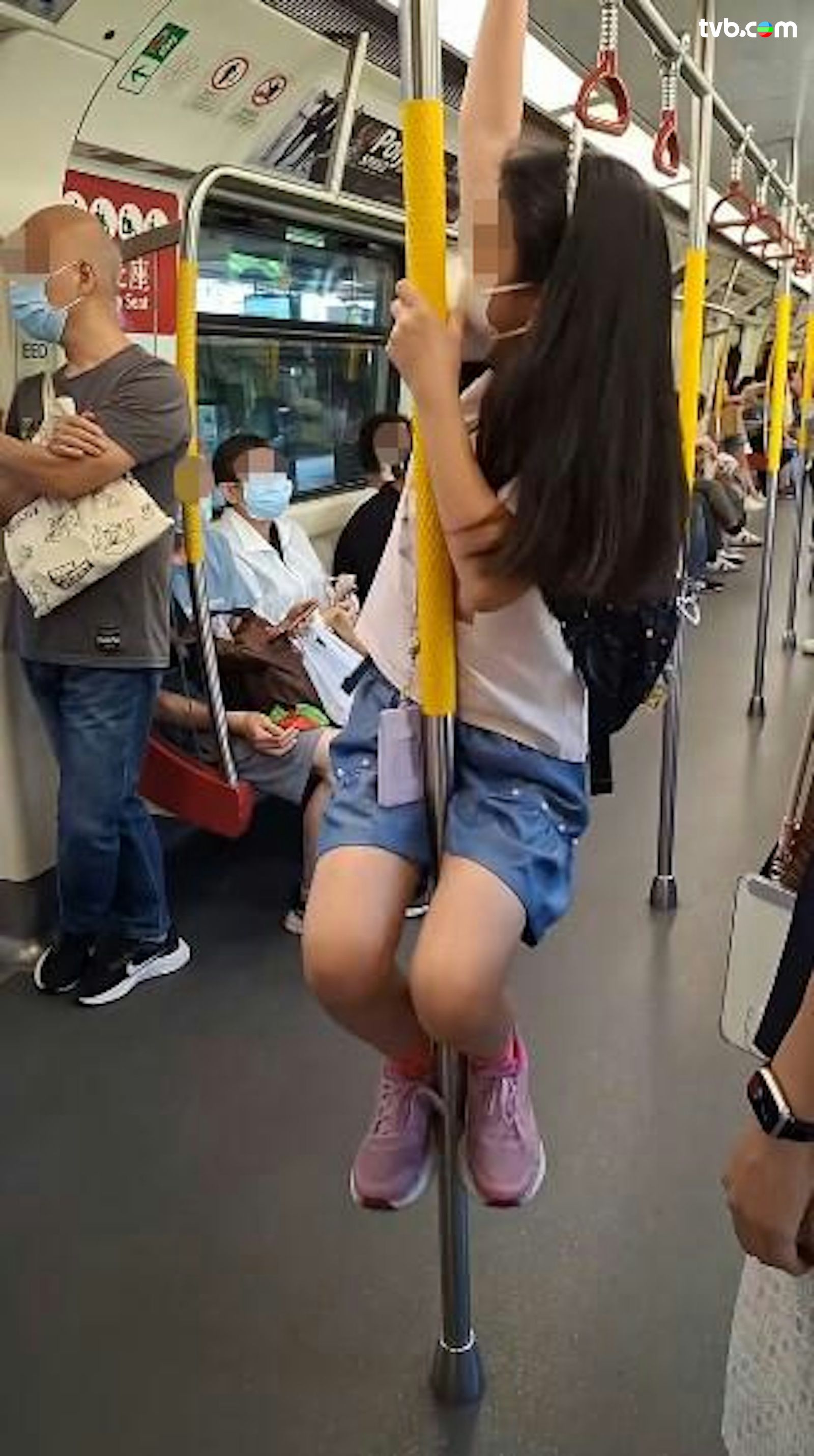 有港男上載影片,指其乘搭港鐵時,目睹一名女童與母同行,一進入車廂就立即跳起玩吊環扶手;樓主本打算提醒女童母親,怎料對方非但沒有制止,反而親自指導女童如何「上槓、上環!」影片中可見,穿深色背心的母親在旁指導女童以雙腳夾住扶手、再用右腳踏上去,場面令人咋舌!