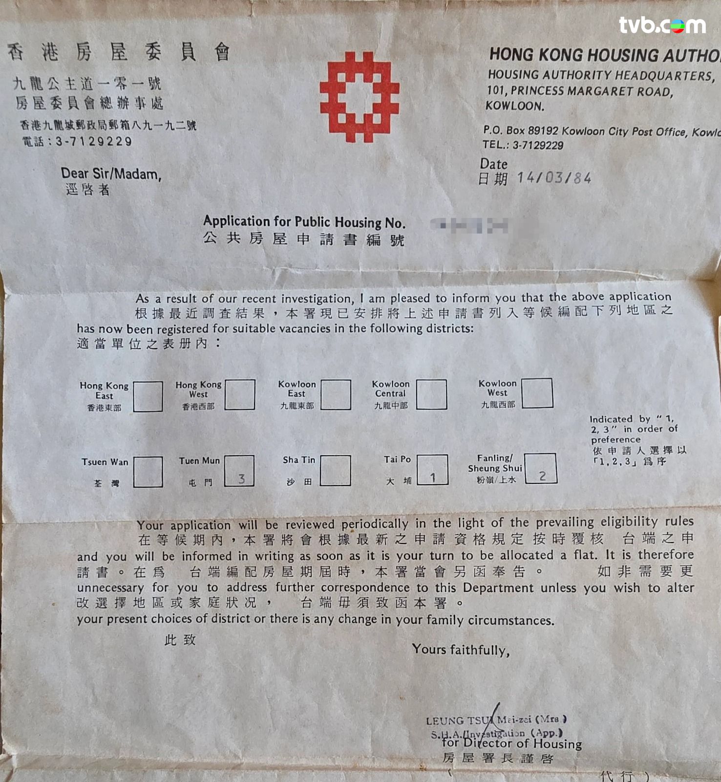 該信日期為1984年3月14日,距今逾40年,紙張已略見泛黃,信上印有房委會標誌,並列出當年位於公主道的總辦事處地址、以「3」字開首的七位數電話號碼。內容顯示為「公共房屋申請書編號」通知,正式確認申請已獲登記,並列出當時可供選擇的地區。從文件可見,事主父親當年填報的首三個志願依次為大埔、粉嶺/上水及屯門。信件上部分內容疑以打字機輸入,充滿歷史痕跡!