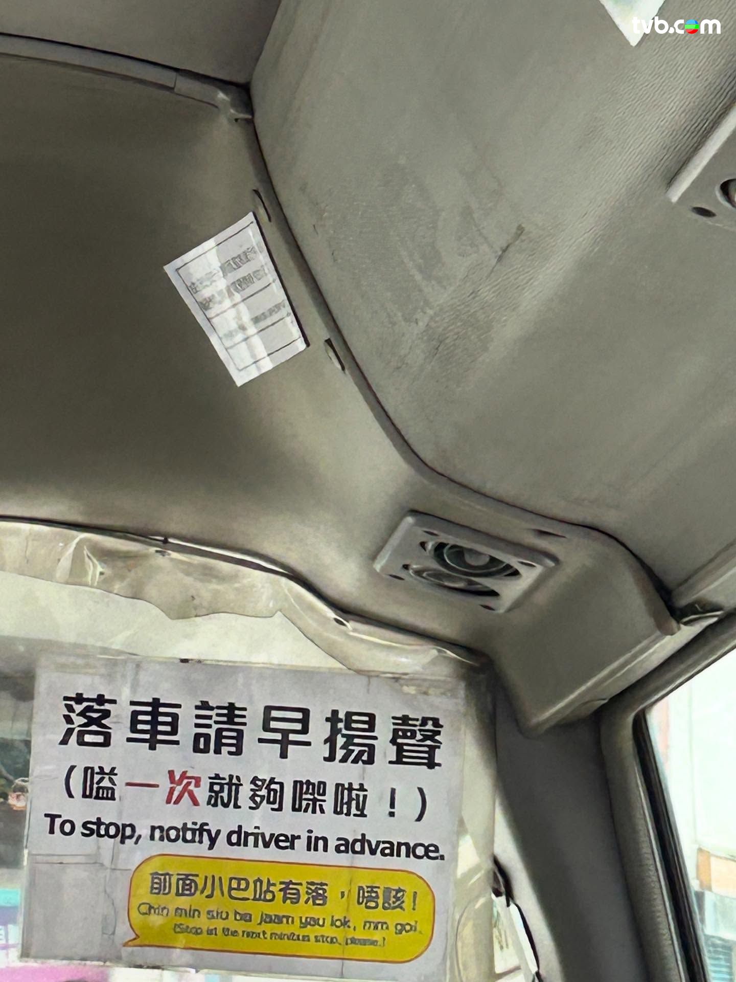 有網民近日分享相片,可見某專線小巴車廂內,車頭位置貼上告示,寫明「落車請早揸聲(嗌一次就夠㗎啦)」,並附英文拼音說明,用以教導外國人說出句子「前面小巴站有落,唔該!」樓主則在帖文笑稱「yau lok mm goi,想知外國人讀出嚟會點!」
